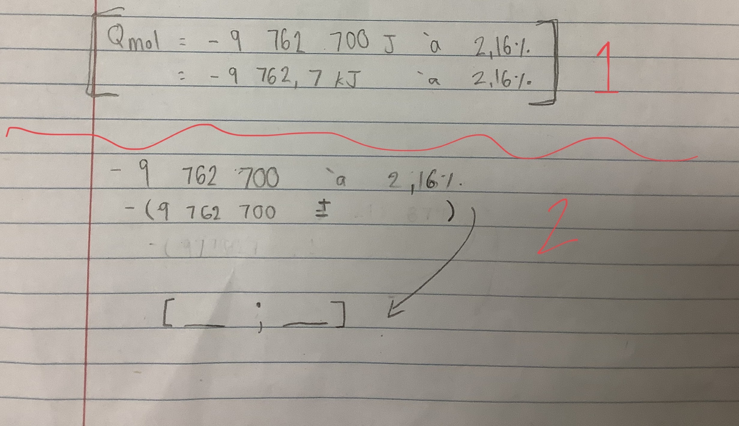 Secondaire 5 • 1aBonjour, j'ai 2 questions. Tout d'abord, la première chose entre parenthèses est-elle correcte ? La deuxième question concerne les calculs d'incertitudes. Comment passer du pourcentage aux parenthèses ?