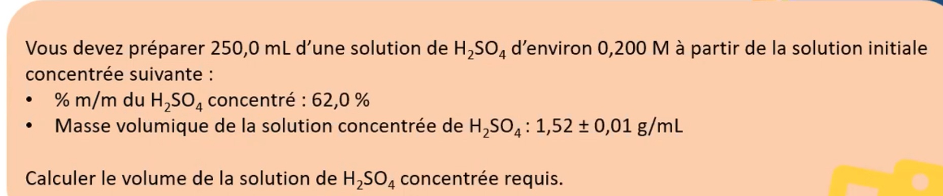Vous devez préparer 100,0 g de solution H2SO4 de fraction molaire 0,00500 à partir d’une solution De H2SO4 concentrée à 62,0 %m/m dont la masse volumique est de 1,52 g/mL. Calculer le volume de la solution de H2SO4 concentrée à mesurer ainsi que le volume d’eau à ajouter, en supposant que la masse volumique de l’eau est de 1,00 g/mL. Calculs complets.