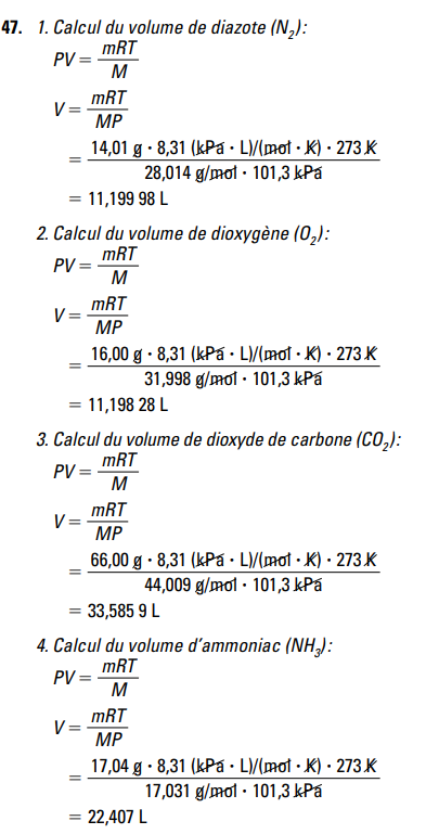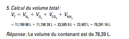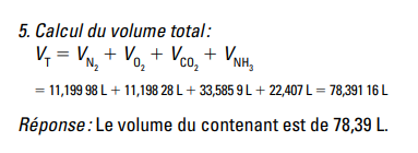 parce que dans le corrige , ils ont calculé le volume de chacun des gaz avec la loi de gaz parfait pour ensuite les additionner tous ensembleje sais pas si ma maniere est aussi valide parce que j obtiens une reponse de 89.62L c est un peu loin de 78.39L donc je pense pas que les chiffres significatifs seraient la cause de l ecart. merci de me dire si ma facon est logique ou pas ; )
