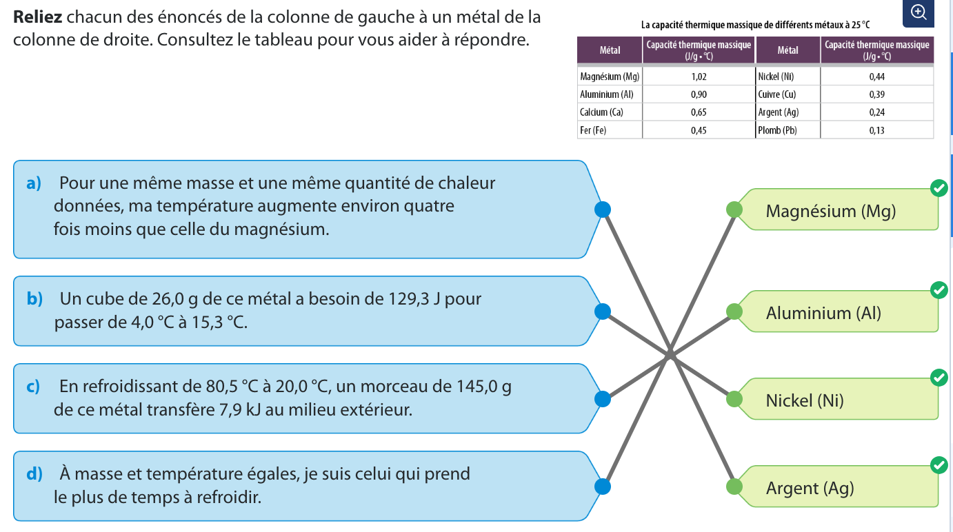 Secondaire 5 • 1aBonjour, je ne comprends pas pourquoi la réponse à la question a) est l'argent, car quand je remplace m et delta T par des valeurs fictives dans l'équation, j'arrive toujours à 4,08 J/g x ºC, soit le quadruple du magnésium plutôt que le quart. Pouvez-vous m'aider svp? Merci d'avance!