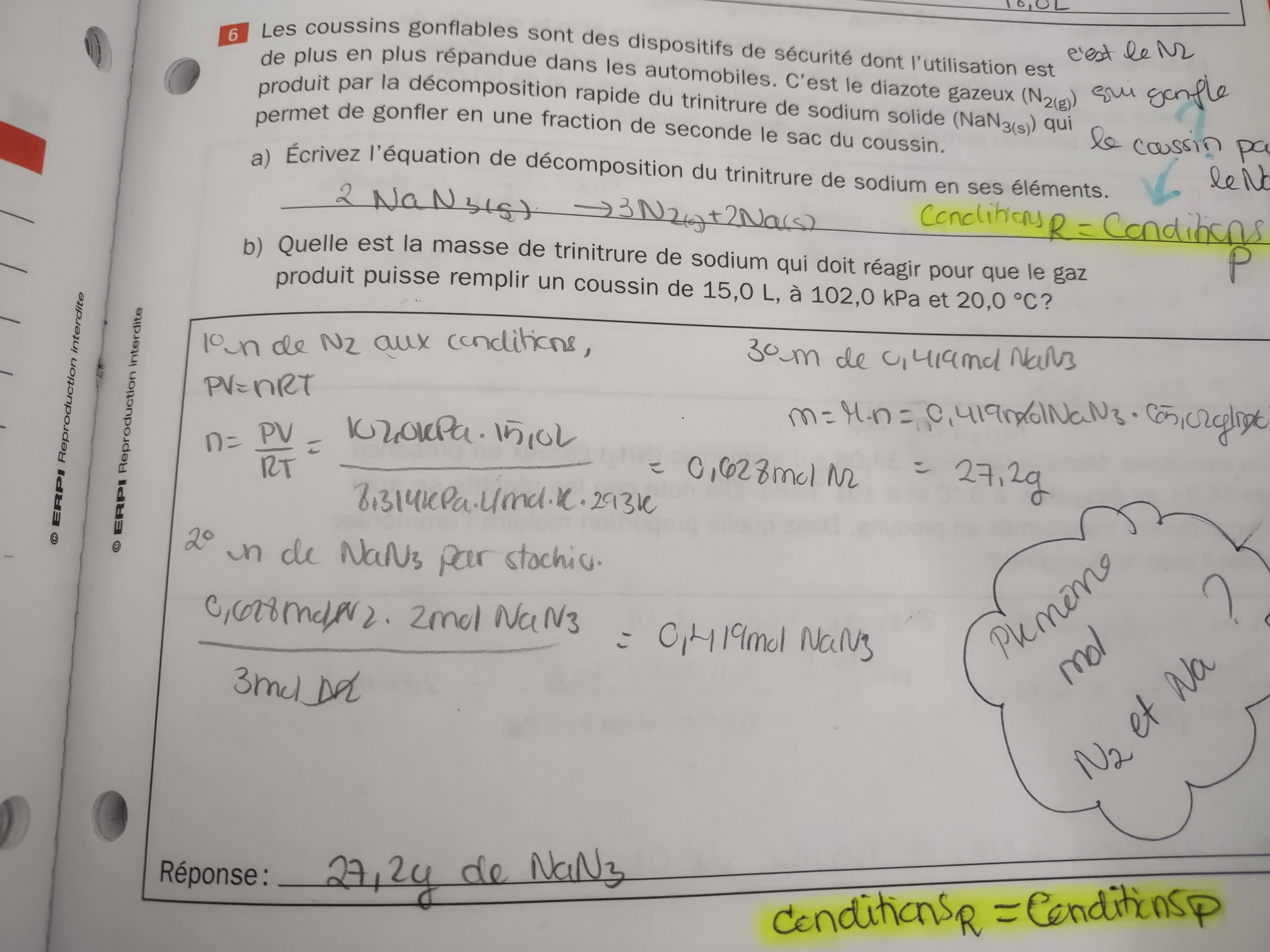 Secondaire 5 • 1aCe que je veux dire par le nb.de mol de Na c'est qu'il est identique à celui du N2 , donc si dans l etape 1 je remplaces l etape par calcul de n de Na aux condtions ... j'obitens la meme chose .