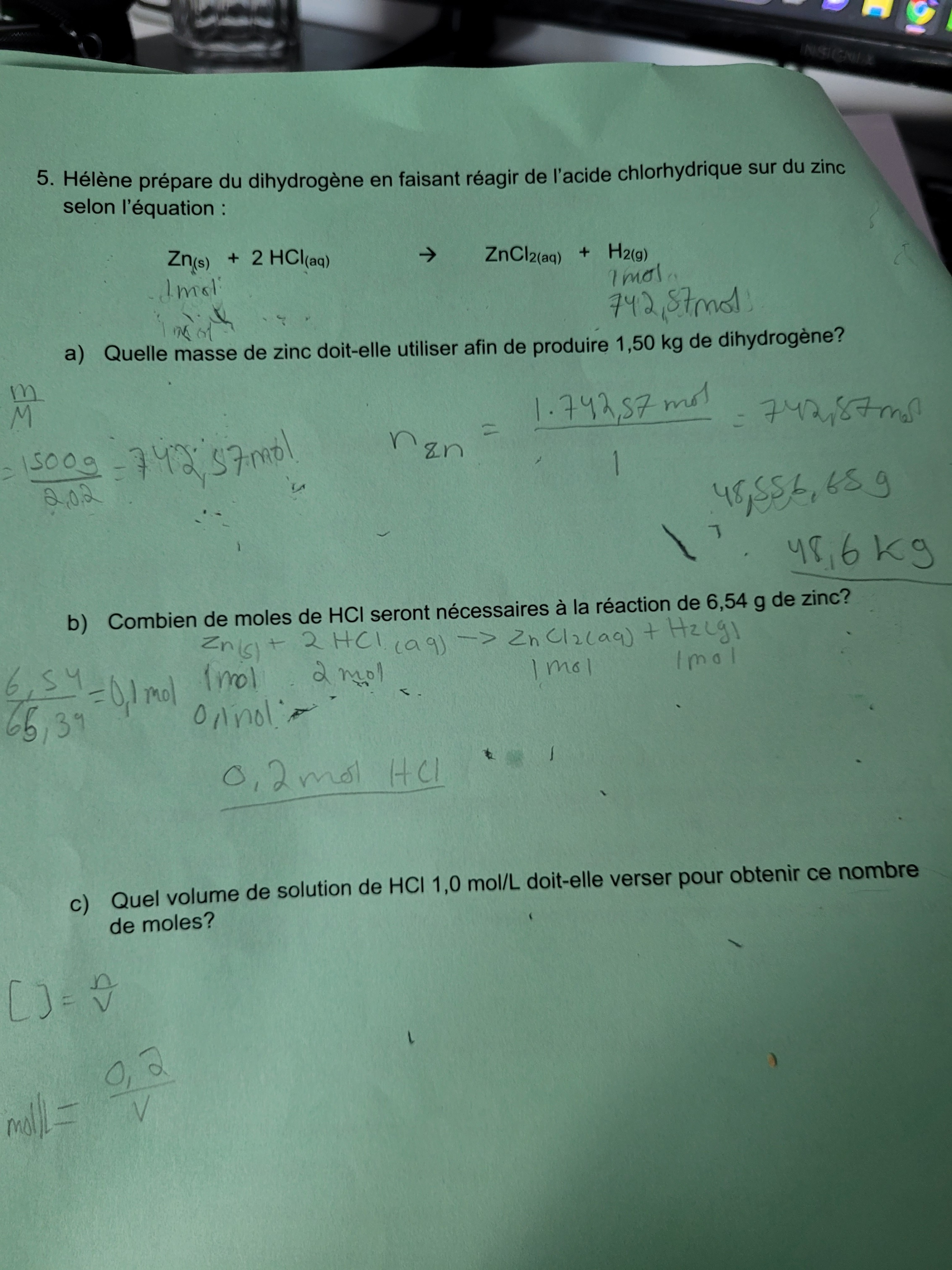 J'ai un rapport de laboratoire de chimie a rendre. Il nous demande de trouver le nombre de mol de H2 dans un volume déterminé de solution de H2.