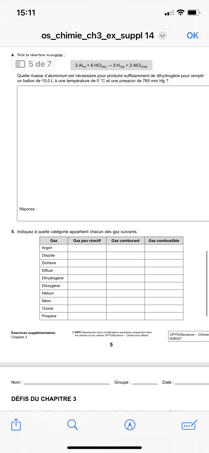 Secondaire 5 • 2abonjour, pouvez vous m'aider a reconnaitre une propriété chimique et a reconnaitre un gaz réactif un gaz comburant et un gaz comburant.