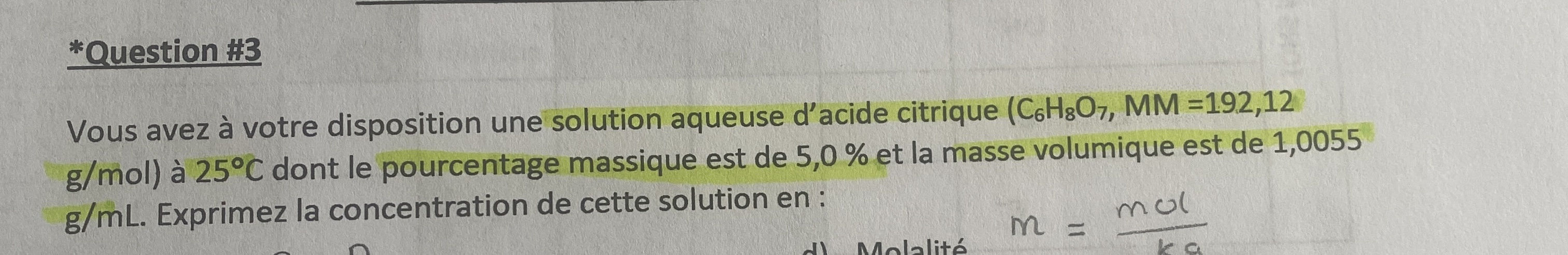 Postsecondaire • 2aBonjour, je ne comprend pas comment trouver la molarité et la molalité avec le pourcentage massique, la masse volumique et la masse molaire