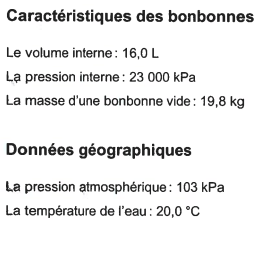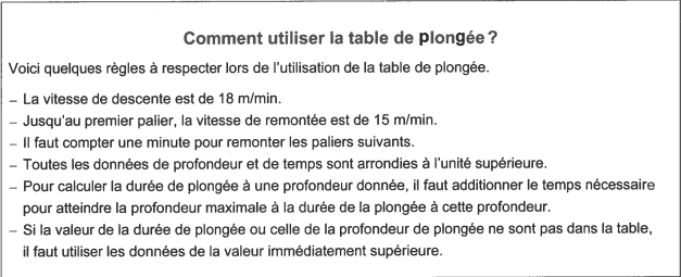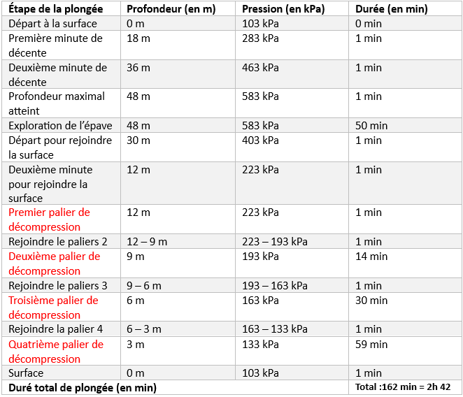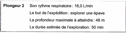 Le problème à résoudre : Calculez la quantité d’air nécessaire pour la durée totale de plongée du plongeur choisi. Comparez votre réponse avec la quantité d’air que votre plongeur consommerait à la surface pour cette même période de temps.
