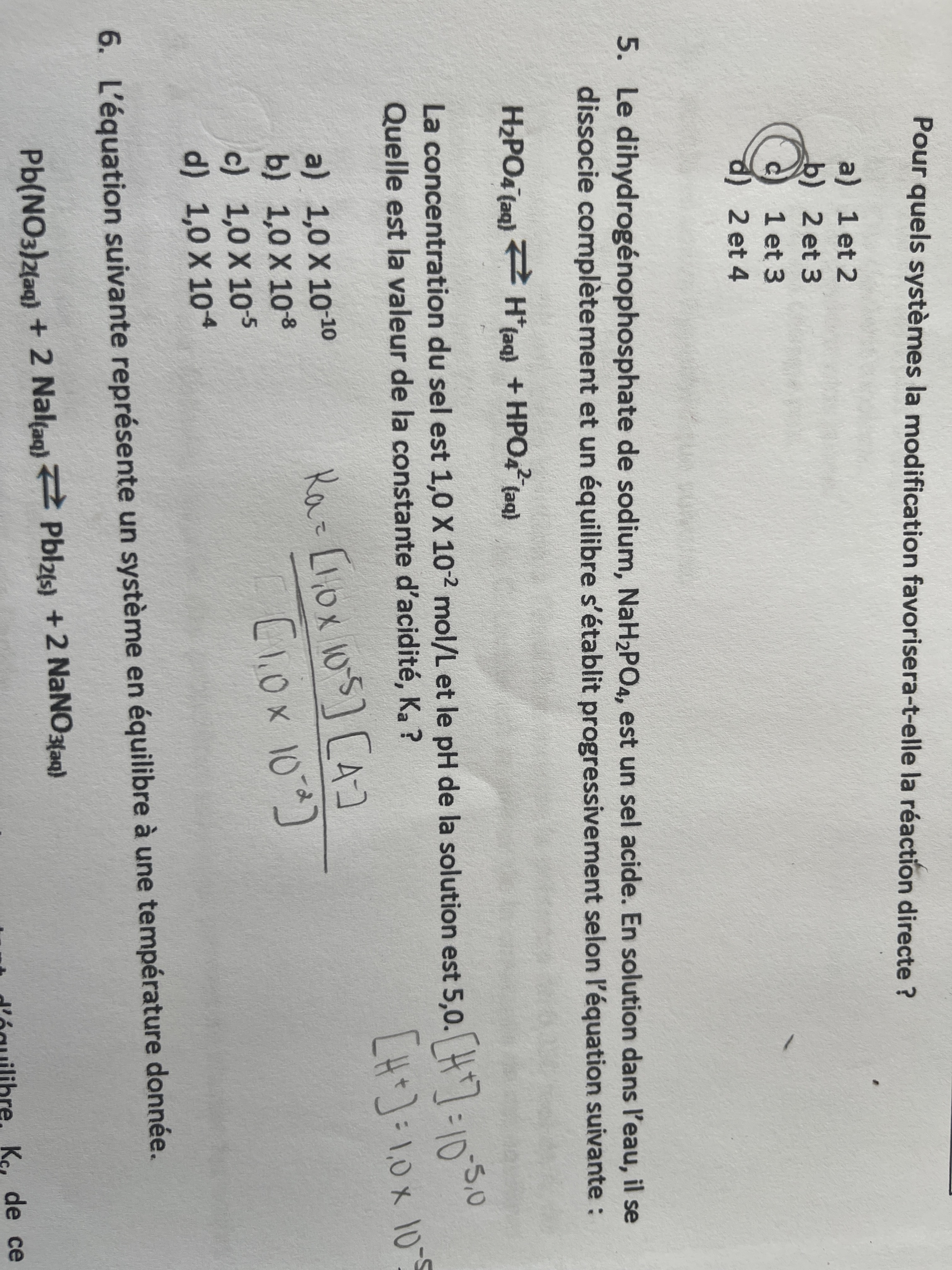 Secondaire 4 • 2aCalculer le volume d’une solution de NaCI sachant qu’elle contient 0.0552 mol de soluté et que sa concentration est de 5,00 g/L.