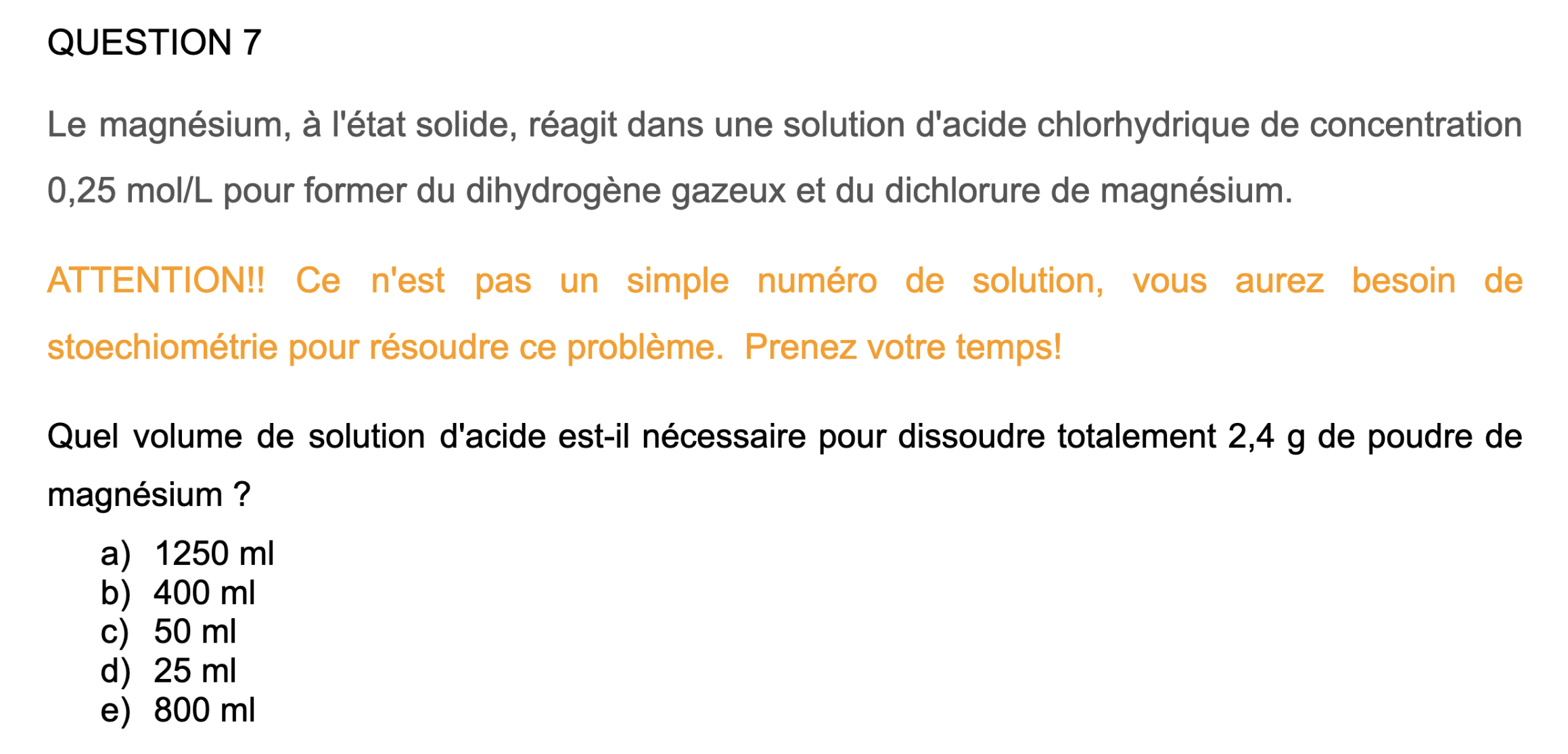 Secondaire 5 • 2a"On fait réagir complètement un morceau de 0,84 g de CaCO3 avec de l'acide chlorhydrique selon l'équation suivante: