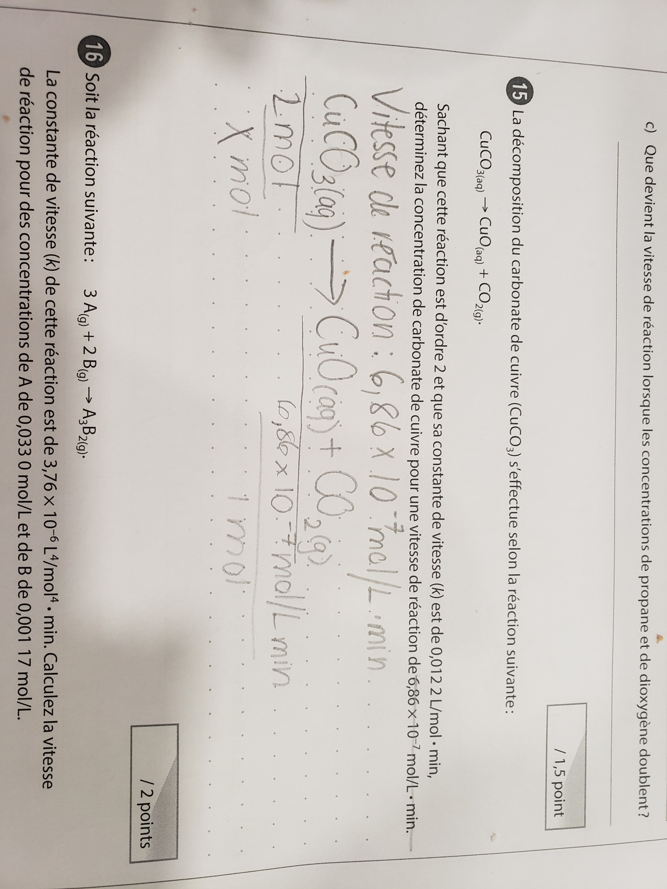 Sachant que cette réaction est d'ordre 2 et que sa constante de vitesse( k) est de 0,012 L/mol. Min, déterminez la concentration de carbonate de cuivre pour une vitesse de reaction de 6,86 ×10-7 mol /L.min
