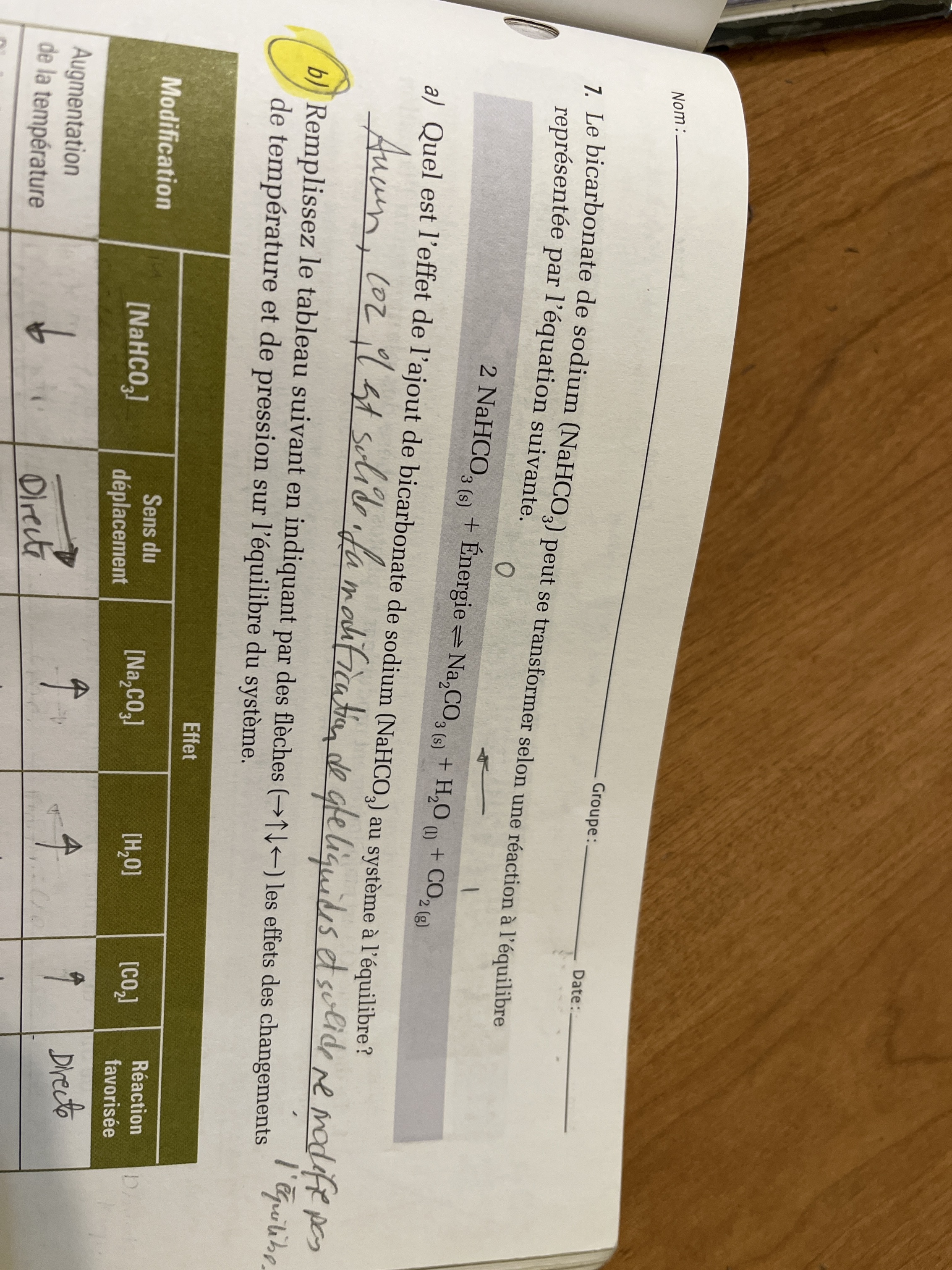 Je voulais savoir si la modification des facteurs d’équilibre comme la température fait varier les concentrations des substances solides et liquides? Genre par exemple, dans la photo ci-dessous, est-ce que l’augmentation de la température fait diminuer NaHCO3 ( un solide) ou augmenter H2O ( liquide)? Ou est-ce qu’on doit simplement laisser ces cases vides….
