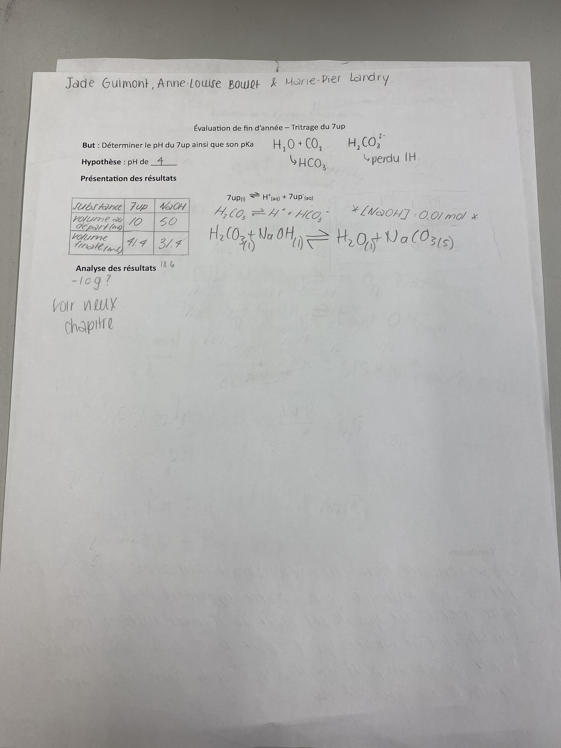Secondaire 5 • 2aBonjour, est ce que quelqu’un serait en mesure de nous aider à trouver l constante d’acidité (ka) de ce système en sachant que le naoh a une concentration de 0,01mol/L et que nous avons utilisé 18,6 ml de naoh pour neutraliser 10 ml de h2co3