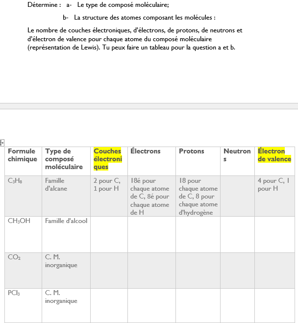 Secondaire 4 • 2aBonjour ! Je dois identifier le nombre de couches électroniques, d'électrons, de protons, de neutrons et d'électrons de valence pour chaque atome du composé moléculaire (formule chimique) que j'ai : C3H8, CH3OH, CO2, PCl3, C4H9OH, C5H11OH, NH3, HCOOH, N2, F2, O3, CH3COOH, H2O et C2H4.Mais j'ai du mal à le faire ? Pouvez-vous m'aider en me montrant la procédure, s'il vous plaît ?