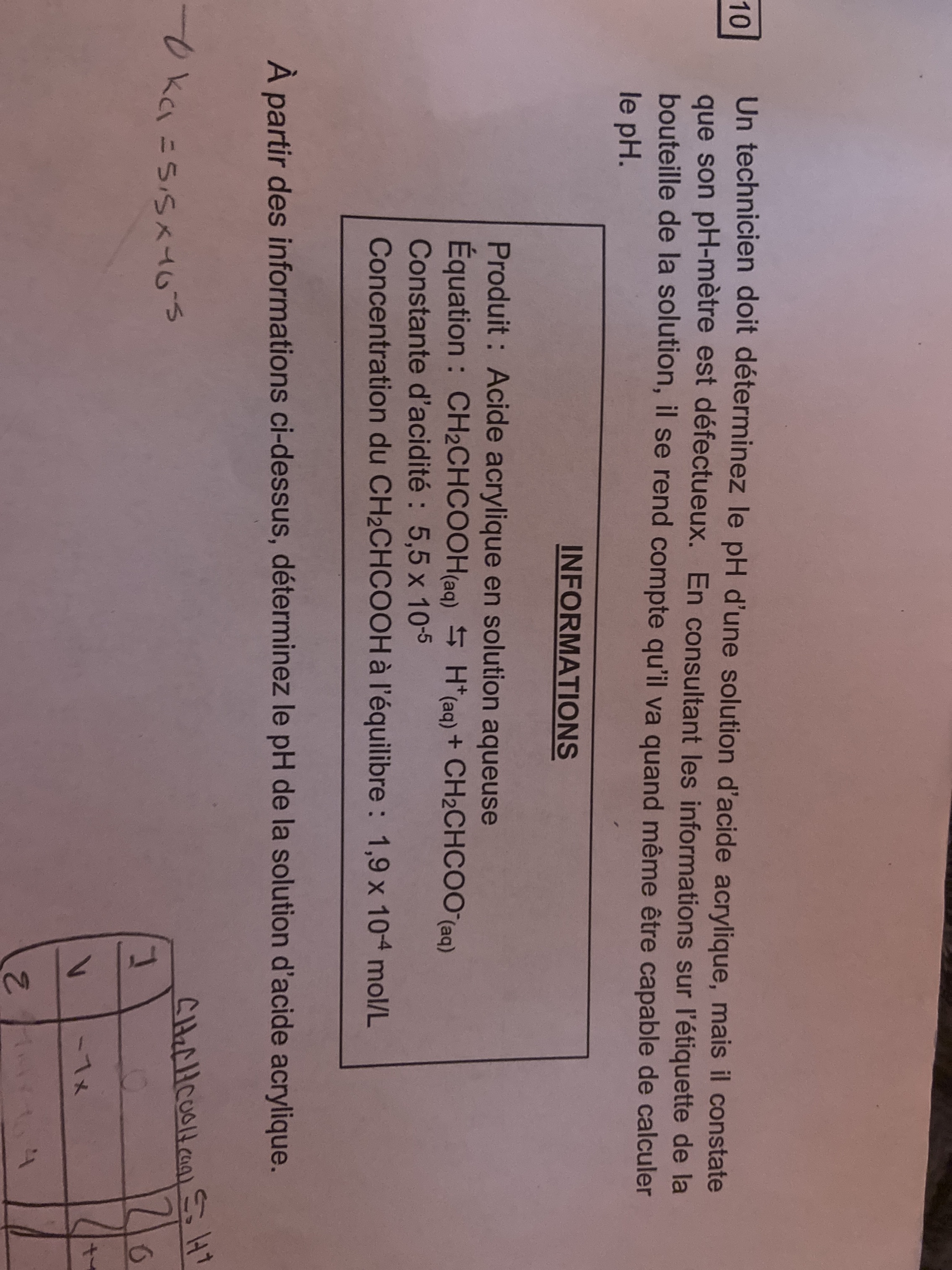 Secondaire 5 • 2aQuelle est la relation existant entre la constante d'acidité, le pH et la concentration en acide ? c'est une question pour finir un labo.