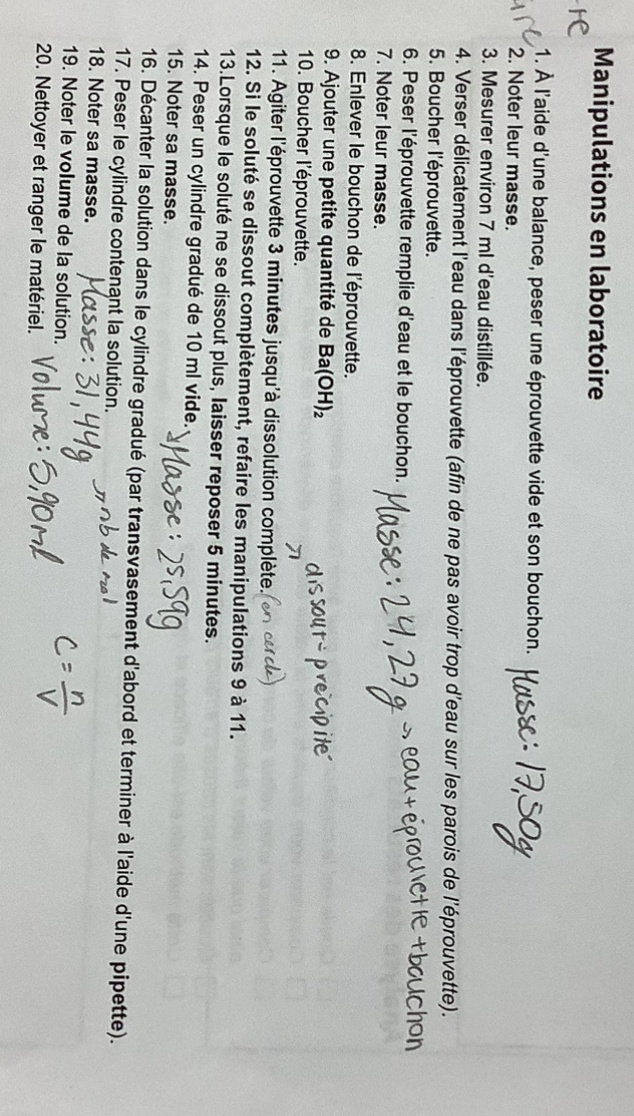 Secondaire 5 • 2aBonjour, suite à un laboratoire sur la dissolution du Ba(OH)2 dans de l'eau, je dois trouver expérimentalement le Kps du Ba(OH)2. Je sais que son équation pour trouver la constante du produit de solubilité est Ba(OH)2(s) = Ba2+ + 2OH-. Donc que la formule est Kpa-[Ba2+][2OH-12 exposant 2. Mais je n'arrive pas à trouver les concentrations avec les informations que j'ai. Soit que la masse et le volume de l’eau est de 7ml et 6,77g, et pour le Ba(OH)2, la solution est de 5,90ml et 5,85g.