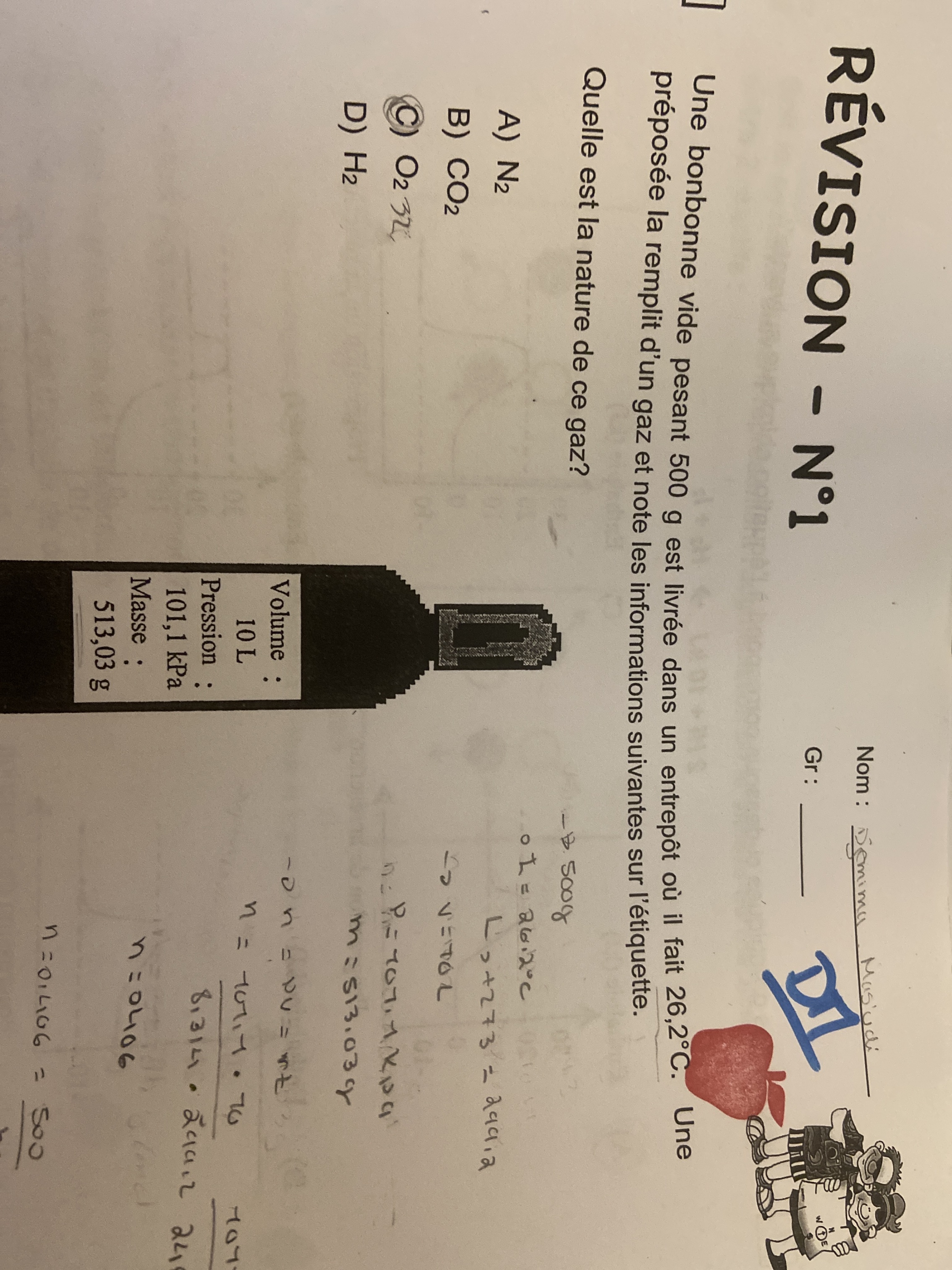 Secondaire 5 • 2aBonjour. J’ai fait un laboratoire en chimie où j’ai décomposé du peroxyde d’hydrogène à l’aide du catalyseur MnO2. Je connais le volume de O2 dégagé et le volume initial de peroxyde (la pression et la température ambiante aussi). Comment puis-je trouver la concentration du peroxyde en %(V/V)? Merci beaucoup!!!
