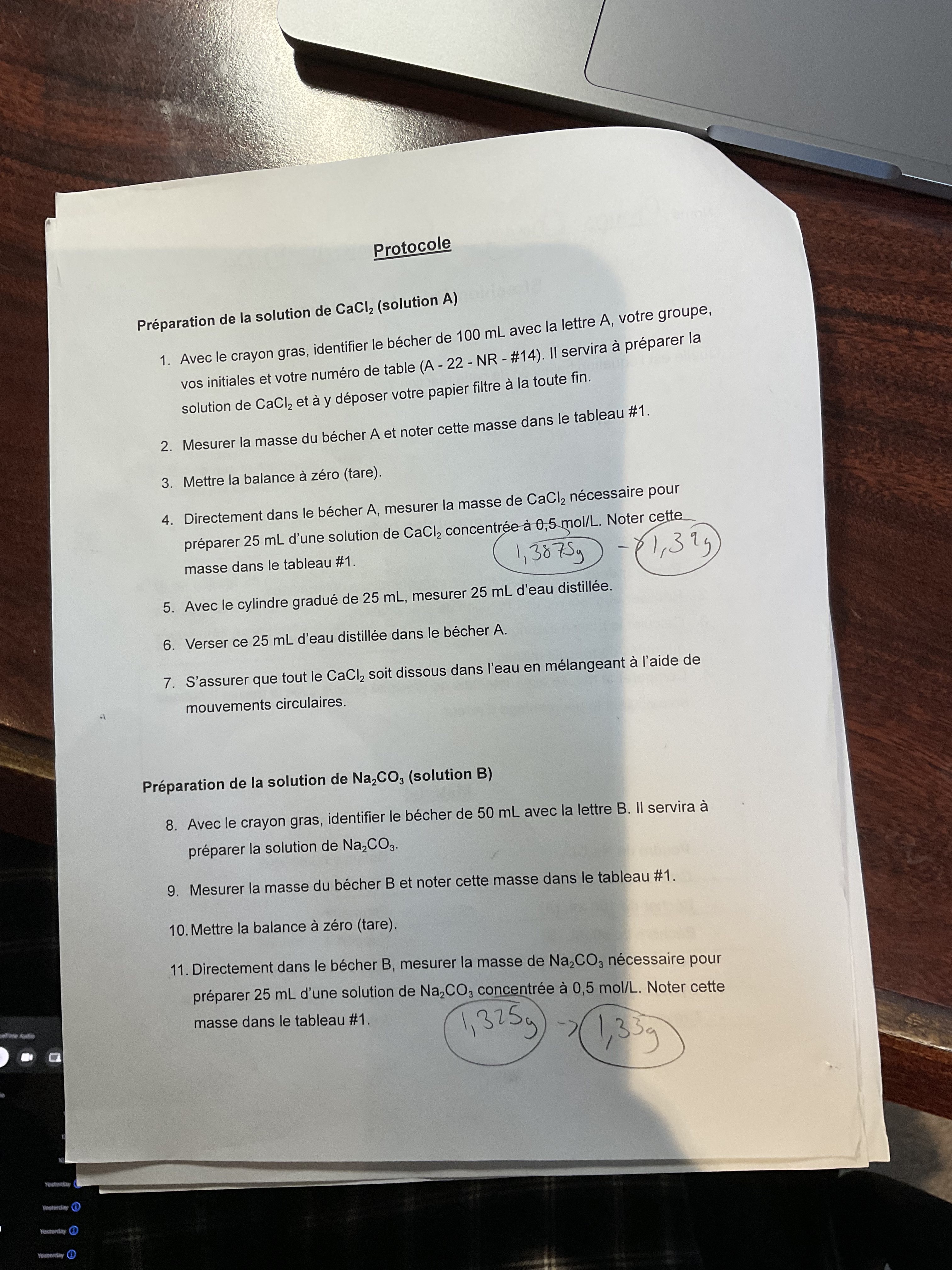 Secondaire 4 • 2aOn me dit de calculer la massa de carbonate de calcium (CaCO3) qui résulterait du mélange de 25 ml de dichlorure de calcium (CaCl2) à 0.5mol/L.