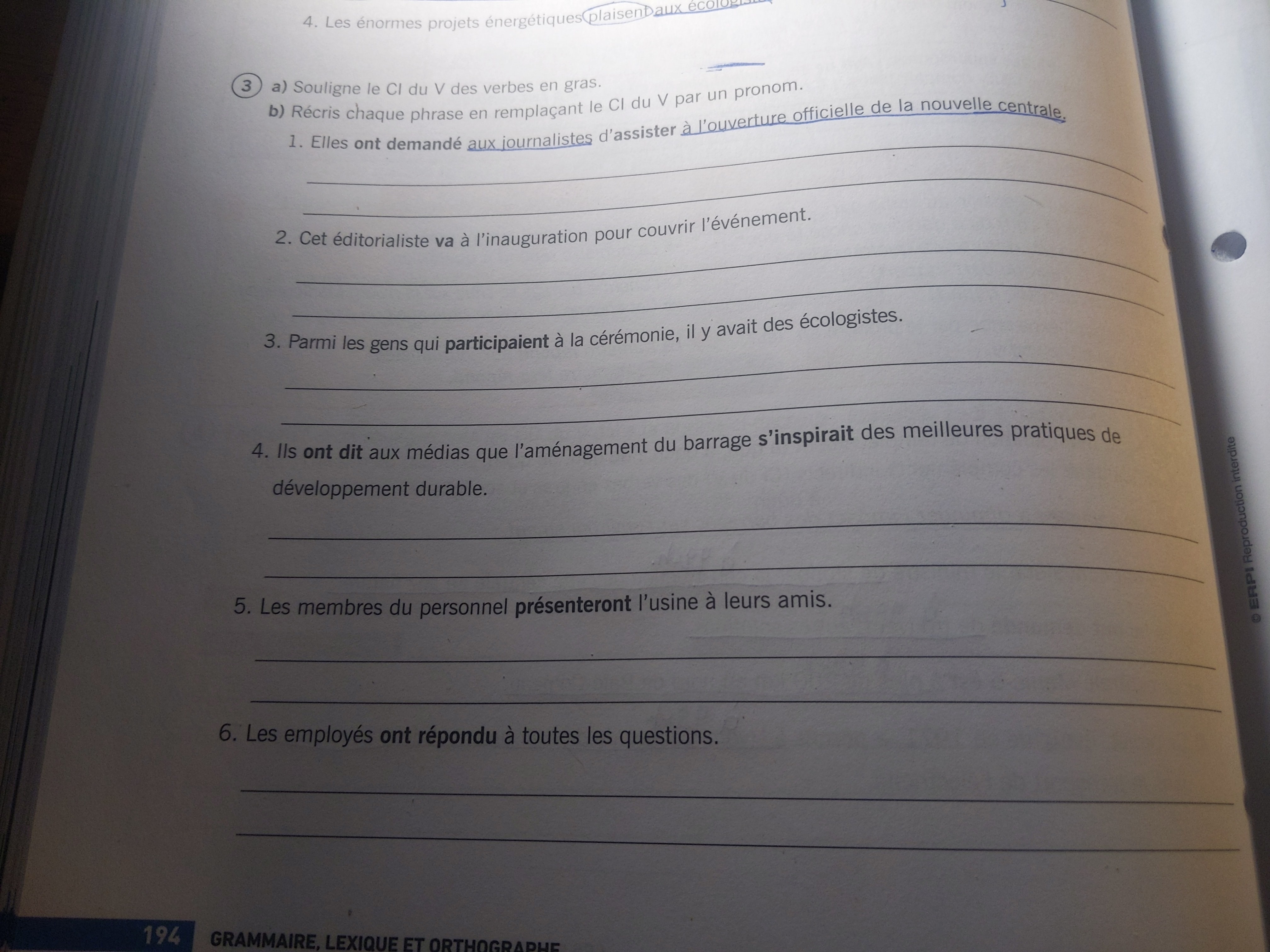 Secondaire 4 • 1aJe n'ai pas compris la consigne parce que ça dit que je dois remplacer le Cl du verbe par un pronom mais je ne vois pas comment?Pouvez-vous me donner un exemple