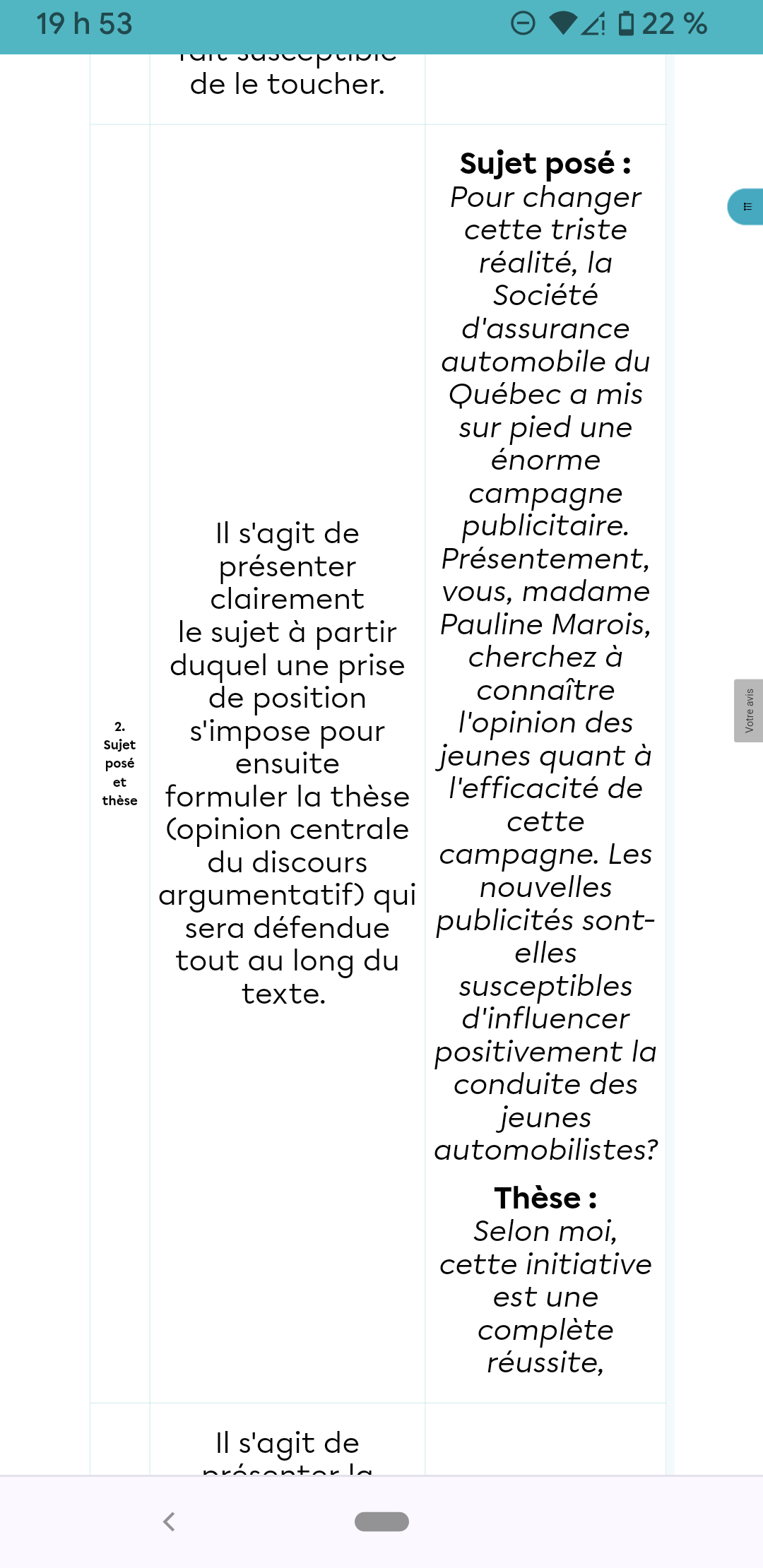 Secondaire 4 • 1aBonjour Laurie c je me sens incompris parce que vous parlez de la thèse tandis tce n'est pas ça que je parlais. Ce que je en comprends pas est Pour changer..... automobilistes je en comprends la façon qu'on la écrit je sais que je dois mentionner le sujet mais je ne sais pas comment faire une phrase. Merci quand c'est explicatif ou argumentatif je n'arrive pas à faire le sujet posé mais pas le texte explicatif j'arrive. La thèse j'ai comprisaid pas cette partie là sujet posé merciLa thèse j'ai compris la question est-ce que le sport est bénéfique pour les jeunes . Pourquoi je n'arrive pas. Parce que je trouve étrange de faire un sujet posé parce que on ne peut pas décrire dans largumentatid on doit argumenter et le texte explicatif sujet posé on doit expliqué et je ne sais pas comment faire le sujet posé tandis que dans le texte explicatif j'arrive parce que pour moi décrire j'arrive à faire le sujet posé merci