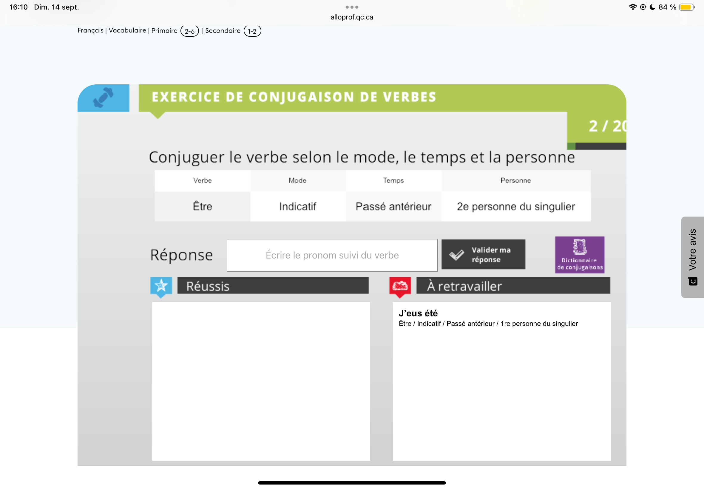 Secondaire 3 • 2mEn français ,Pourquoi dans les test de verbe sur allo prof j’ai toujours mal quand c a la première personne du singulier