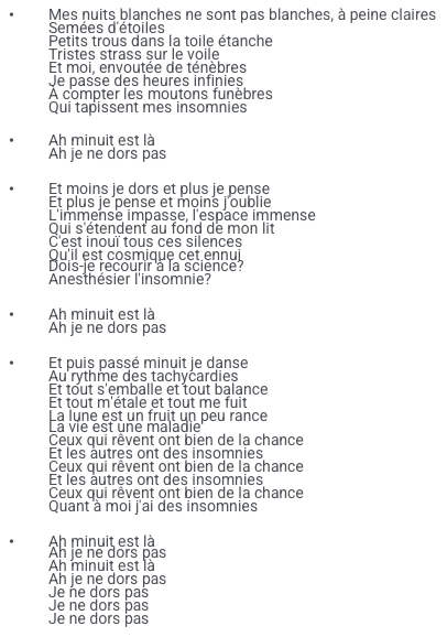 Secondaire 1 • 2aBonjour j’ai vraiment besoin d’aide et vite si possible en fait je fais un oral en français sur une chanson et il faut trouver le Time de variété de language utiliser et surligner des exemples mais je n’en trouve pas voici la chanson si vous pouvez juste me donner quelques exemple (je crois que le language est standard):Ps:j’ai regarder les exemples d’allo prof mais je n’ai pas trouvé se que je cherchais