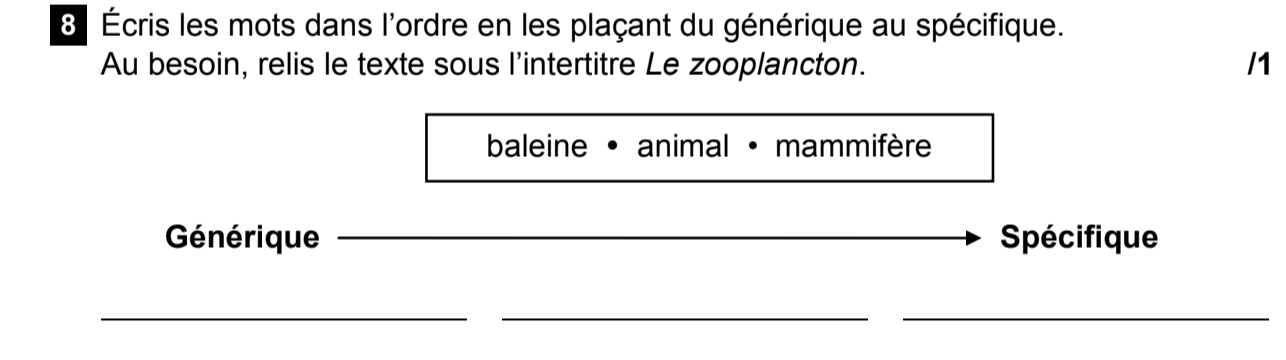 Primaire 5 • 3aBonjour je me demandais ce que ces mots veulent dire car je ne les comprends pas et je ne comprends pas la question:Voici les mots que je ne comprends pas dans la question:Générique te Spécifique comment puis-je répondre à cette question correctement.Et si possible, m'expliquer la question?Merci