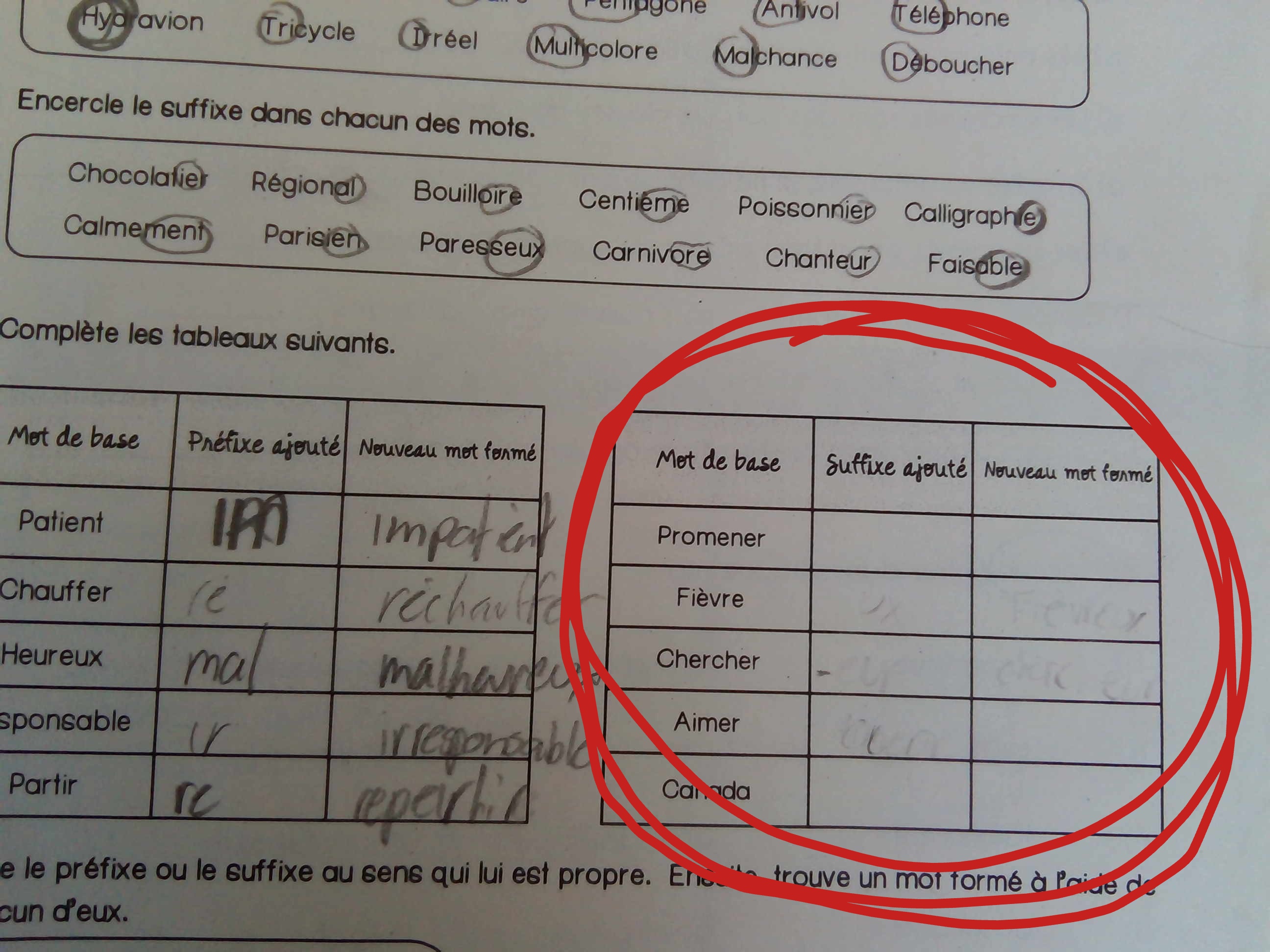 Primaire 6 • 8mPour les suffixes, j'ai un peu de misère pour les mots : Promener,Chercher,aimer. En bref résumé, les verbes. Car j'Ai un numéro d'un travaux de la maison que c'est Préfixe/Suffixe.Bref merci de me répondre rapidement.Amicalement,
