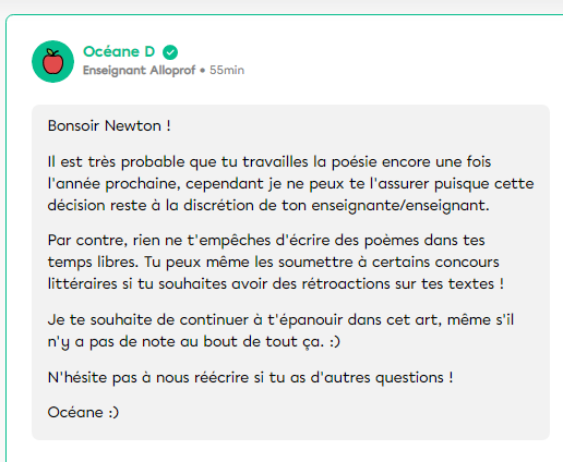 Secondaire 2 • 4aMadame Océane, il y a des concours litéraires? J'en savais pas, pouvez-vous me donner un lien? J'aimerais y participer, on m'a dit que mes poésies et chansons étaient super bonnes.