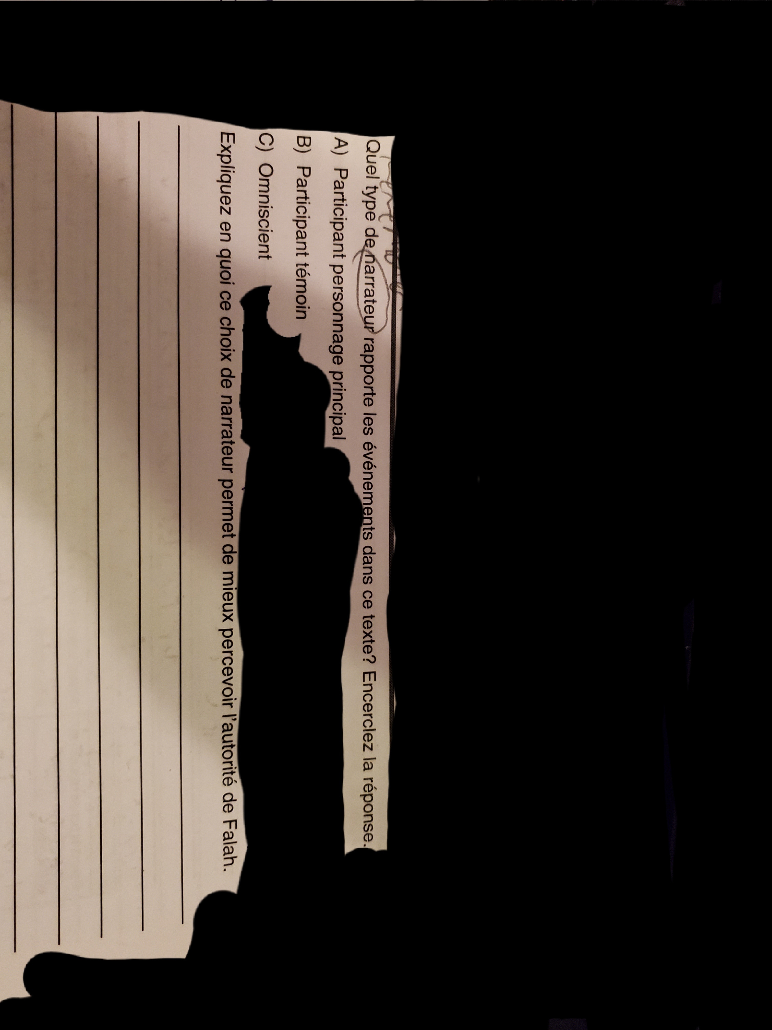 Voici une question que je comprends a moitié j'ai besoin de votre aide dans mon gros cahier de devoir en lecture. Voici le texteEt Voici la questionDite moi si j'ai bons je pense que c'est participant parce que il y a des je ex: Je lui ai dit que je ne savais pas, que je n'étais pas le seul à décider. Si c'est bon dite moi le. Sinon pouvez-vous me donner des indices à trouver quel type de narrateur merci.
