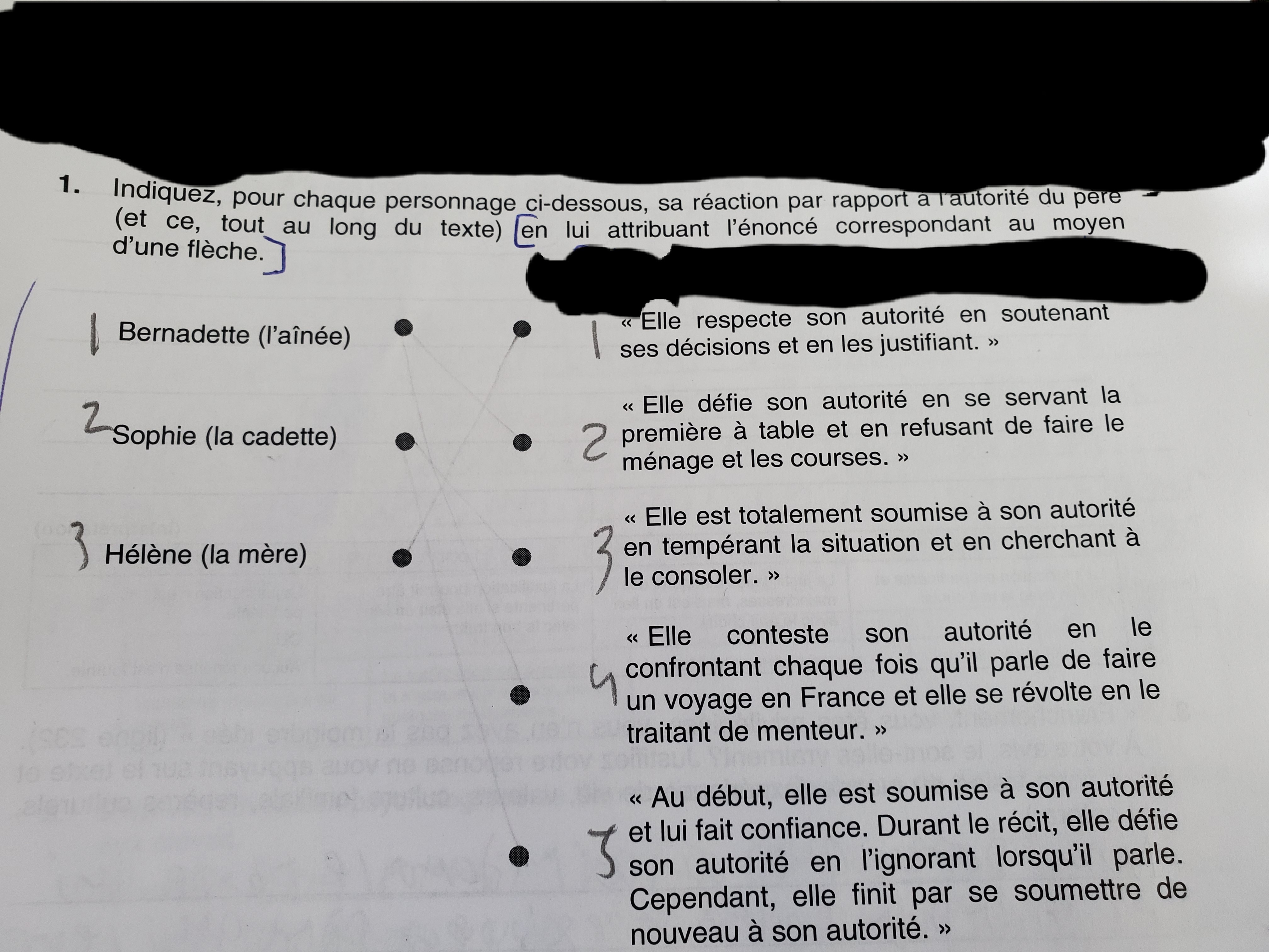 Secondaire 3 • 4aBonjour voici une question que je comprends mais j'ai de la misère à mettre les point à bon personnage