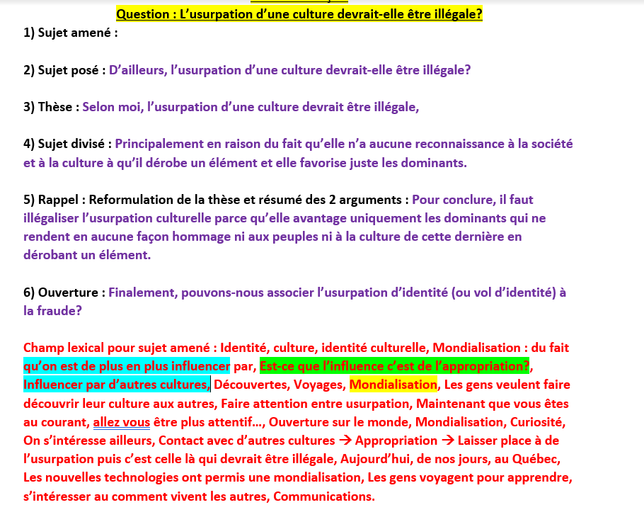 J'aurais besoin d'aide avec le sujet amené de l'écriture de mon texte argumentatif. Aussi, est-ce quelqu'un peut svp valider ma conclusion, car je ne suis pas sûre de l'avoir bien reformulé. (Pour le sujet amené, j'ai fait un champ lexical...)Merci et bonne soirée! :)