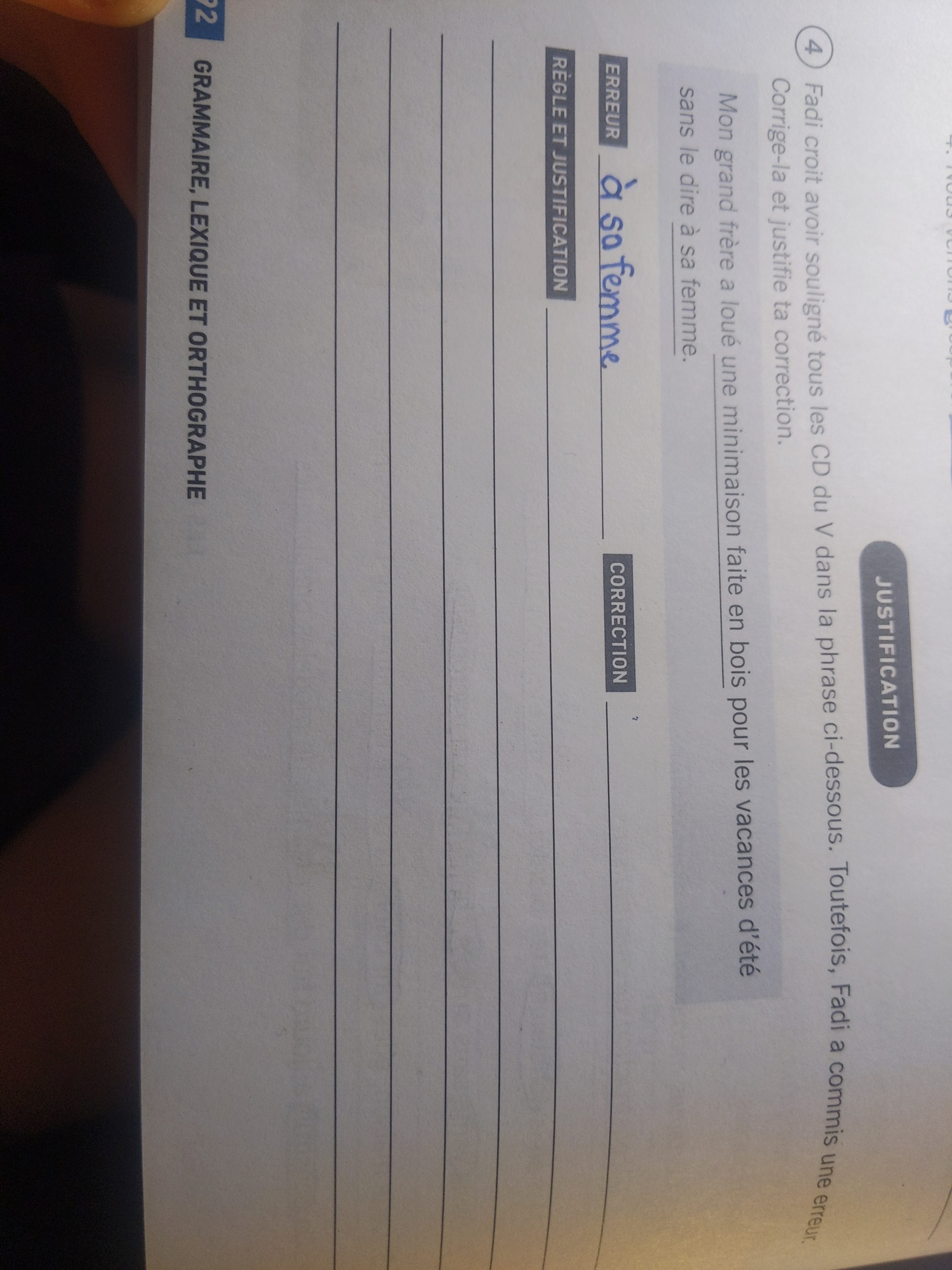Secondaire 4 • 1aBonjour alloprof pour la correction Est ce je dois recopier la phrase au complète pour souligner seulement une mini maison faite en bois ou je dois écrire à sa femme. Je pose cette question parce que je ne vois pas comment je peux copier deux à sa femme puisque je l'ai écrit à l'erreur? Merci