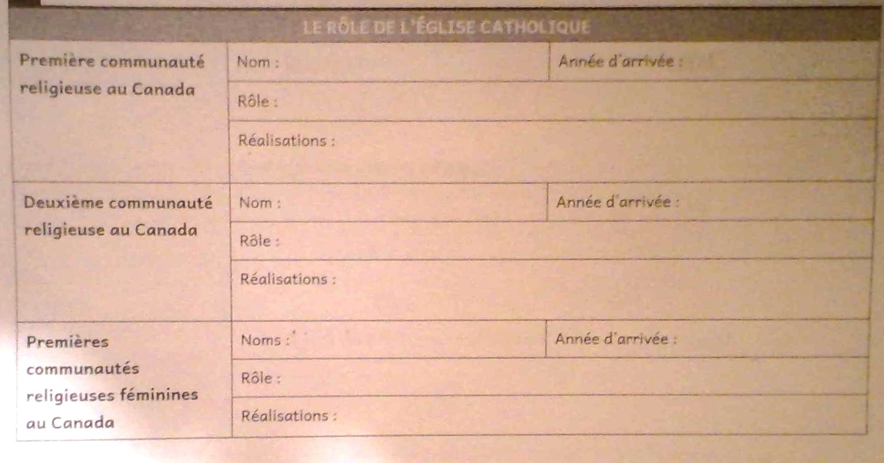 Secondaire 3 • 1aC'est qui la première communauté religieuse au Canada, c'est qui la deuxième communauté religieuse au Canada et c'est quoi les premières communautés religieuse féminines au Canada? Et c'est quoi leurs réalisations, leurs rôles et l'année d'arrivé? (1608 à 1760)