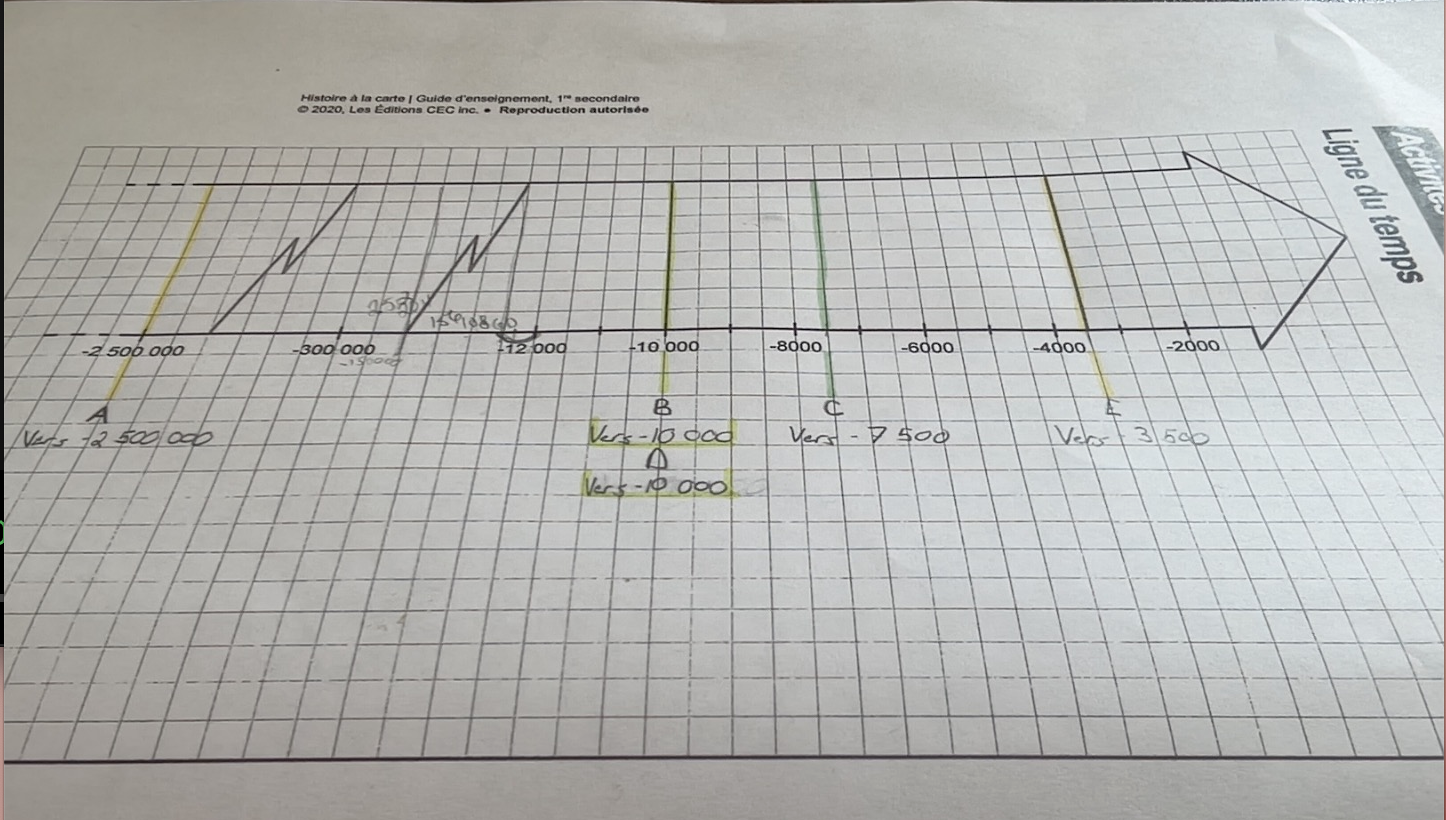 Secondaire 1 • 1aSalut, pouriez vous m'aider à situer sur une ligne du temps : L'installation des premier humains en Europe ( c'est en - 40 000 mais je ne sais pas où placer cet évenement )
