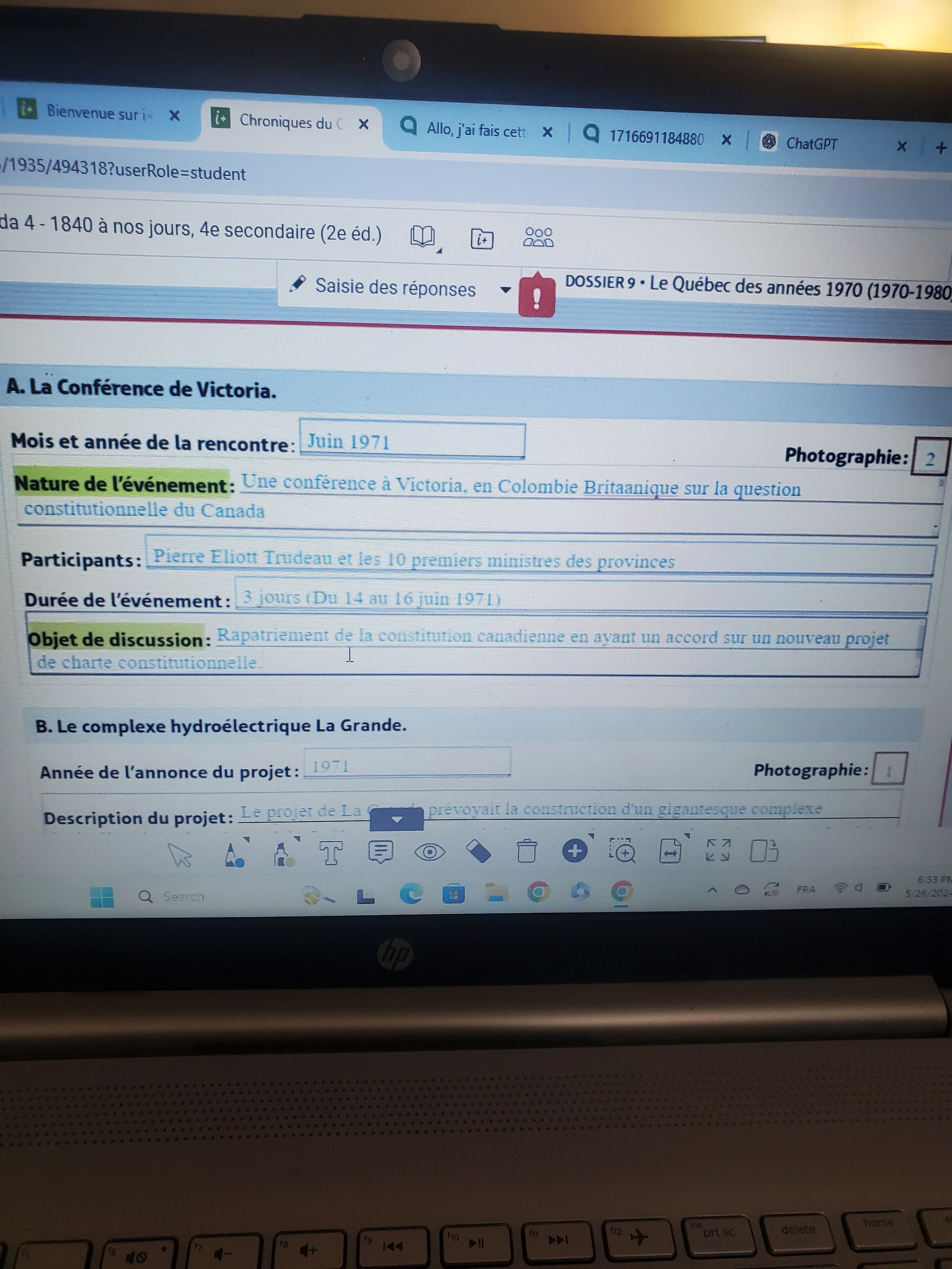 Secondaire 4 • 1aAllo, comme l'examen finale d'histoire se rapprochement, javais fais ces pages mais ma prof a dit que la nature de l'événement et l'objet de discussion n'est pas bon,