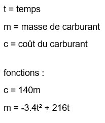 Secondaire 5 • 3aJ'ai l'impression que la règle de la fonction pour obtenir le coût du carburant en fonction du temps selon la masse est une droite et non pas une fonction de degré 2 car le coût augmente en ligne droite selon la masse et le temps. Mais pourquoi la masse contient un exposant à la 2? (typique des fonctions de degré 2). J'aurais tendance à écrire 140(-3.4t²+216t) comme règle mais ce n'est pas possible. Je ne sais pas par où commencer car ma compréhension du type de fonction ne semble pas bonne. Merci beaucoup!