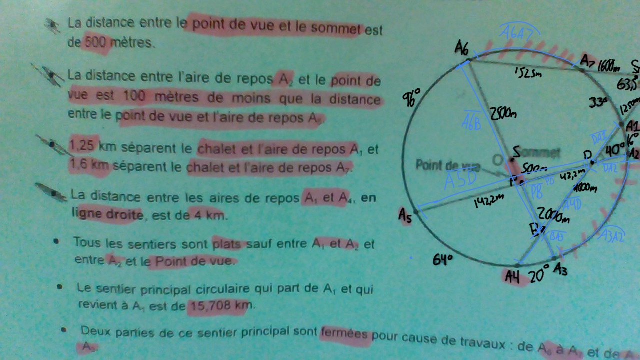 Secondaire 5 • 16jJe cherche encore les mesures des lignes en bleu, A6B, A5D, PB, PD, BA3, A4D, DA1, DA2, et les arc de cercle A6A7 et A3A2. En faisant les théorème, il me manque toujours plus d'une information et je me retrouve bloqué. Pouvez-vous m'aider s'il-vous-plait?