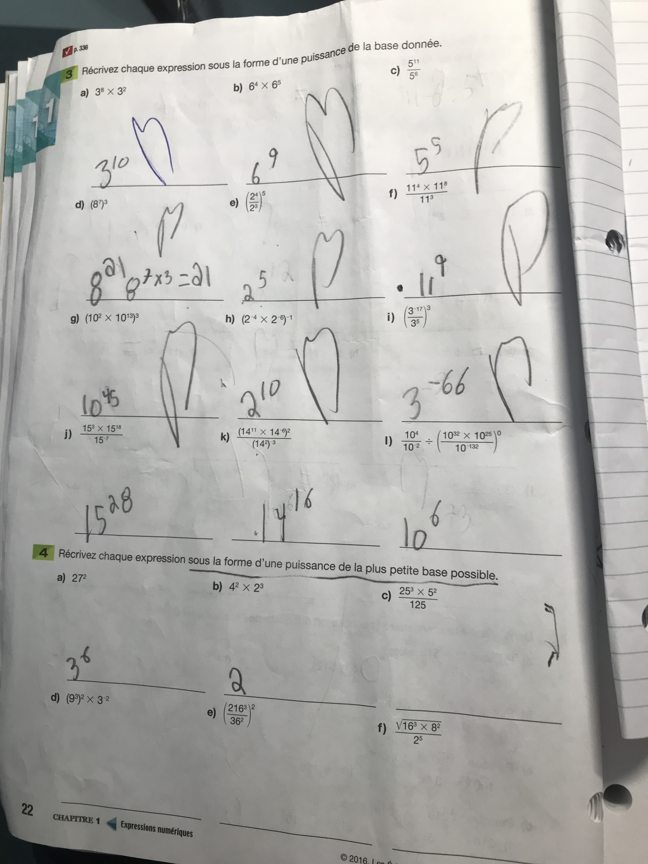 Secondaire 3 • 4aJe ne comprends pas la question 4 de la page 22. Au numéros A) 27 exposant 2 , je ne comprends pas quoi fait dans ce numéros? J’aimerais bien que une personne explique c’est quoi faut faire à ce numéros 4 ? La question que il faut faire c’est Récrivez chaque expression sous la forme d’une puissance de la plus petite base possible.Là j’ai trouver une partir que j’ai trouvé 3 parce que j’ai fais 3 fois 9 égale 27 . J’ai pris 3 dans équation . 3 est la puissance .J’essaye de trouver exposant 10 dans le numéros A) Comment il ont fais pour trouver 10 exposant dans le corriger ?