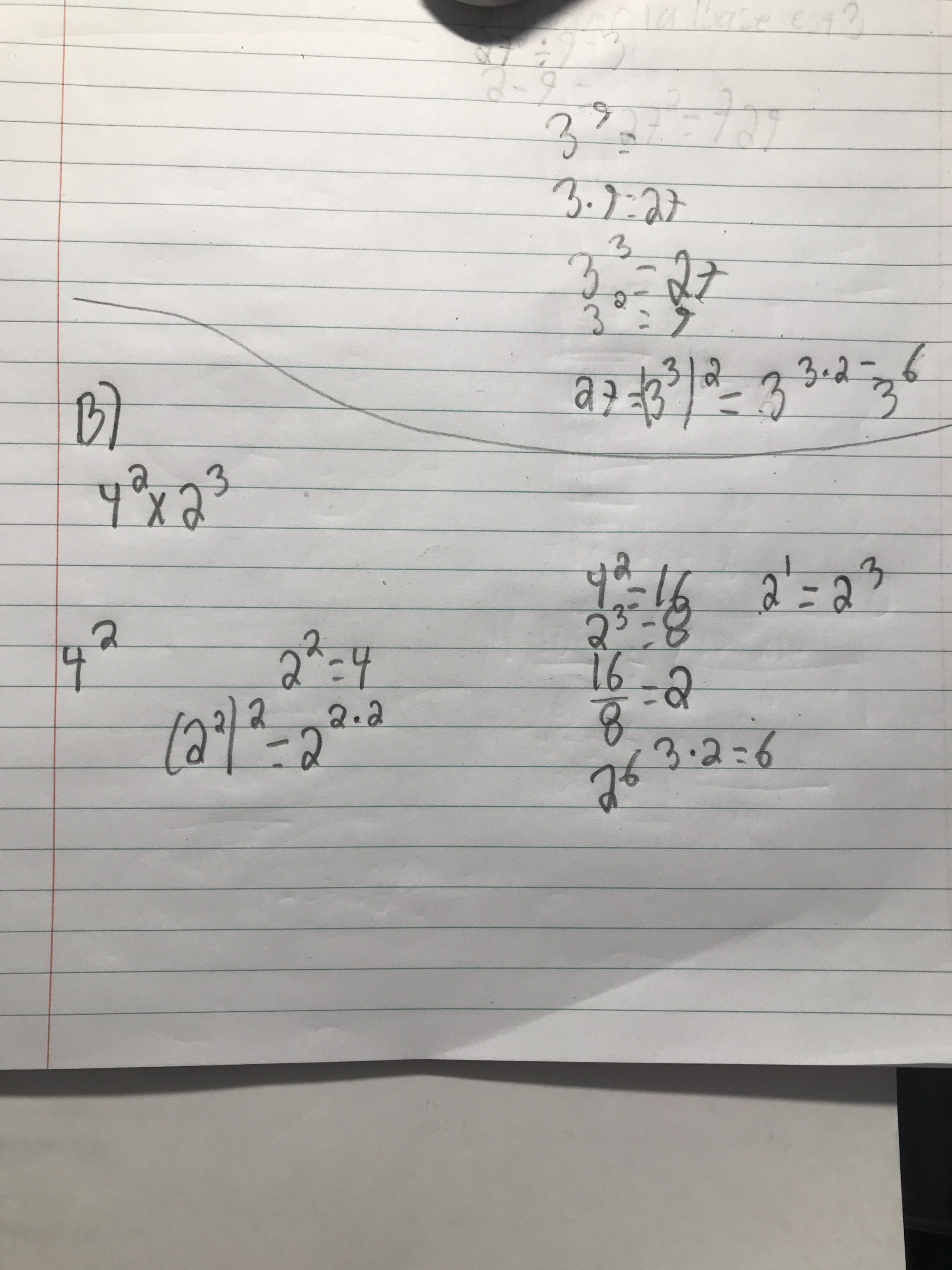 Secondaire 3 • 4aMon calcul du numéros B) . Mes calcul sont bon ? J’ai de la misère à mettre les deux expression ensemble et faire un calcul finale ?J’ai de misère au numéros B . j’ai trouver 2 comme puissance il me jusque à trouver exposant ?