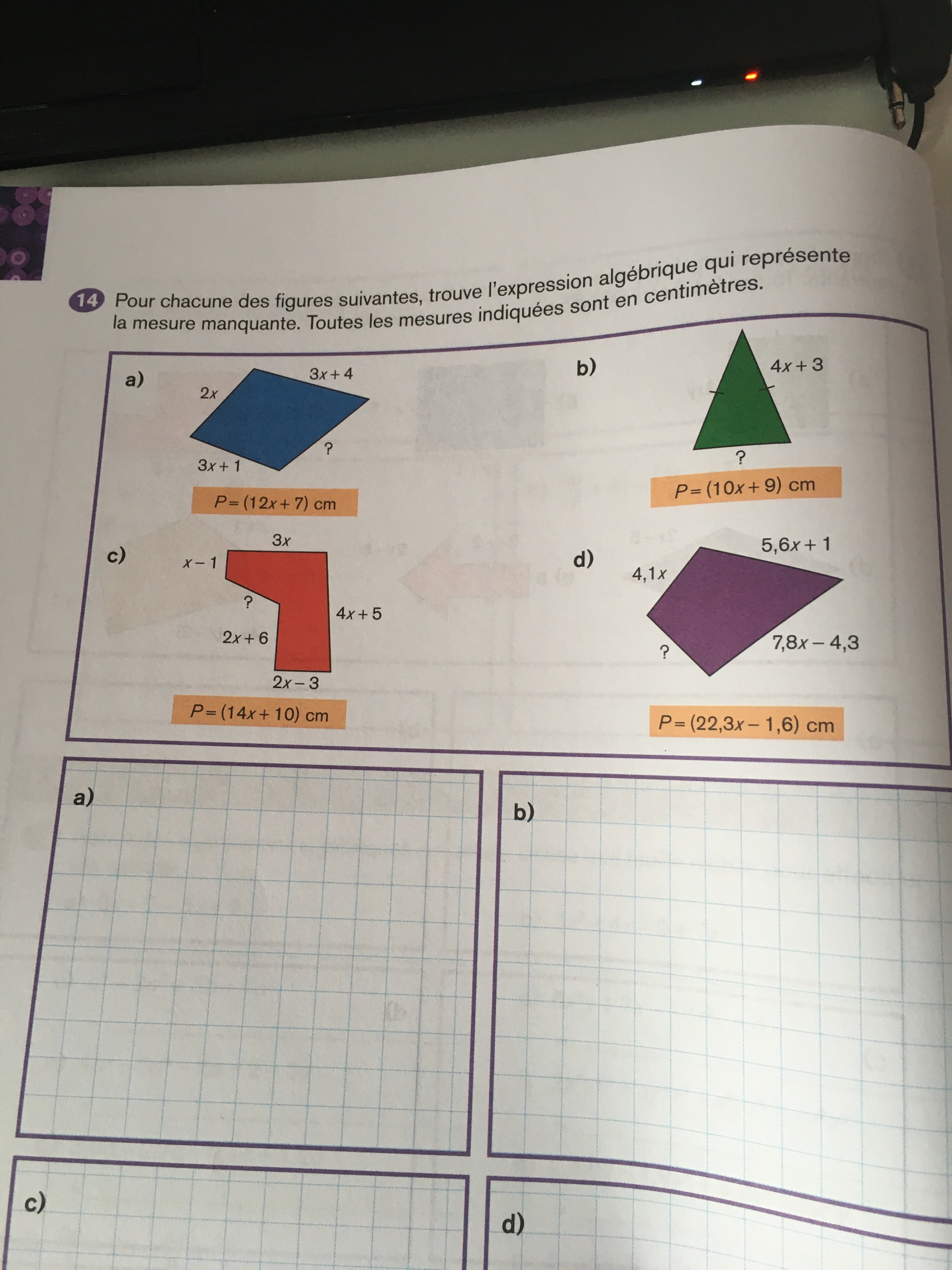 Secondaire 3 • 4aComplétez le tableau après avoir réduit l’expression algébrique ci-dessous. J’ai de la misère à calcul ce numéros ?