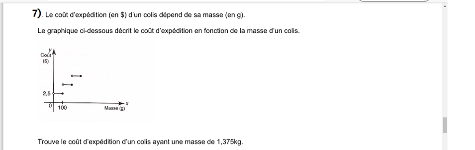 Secondaire 4 • 4aVous voyez ce numéro, en fait moi ca m'a donner comme règle : 2,5 ( 1sur100(x-100) ) + 2,5. Je ne comprend pas ou est mon erreur. ( et aussi dans ce genre de grapgique, quand on a juste un point sur l'axe des y est-ce que ca veut dire que c'est direct le a)