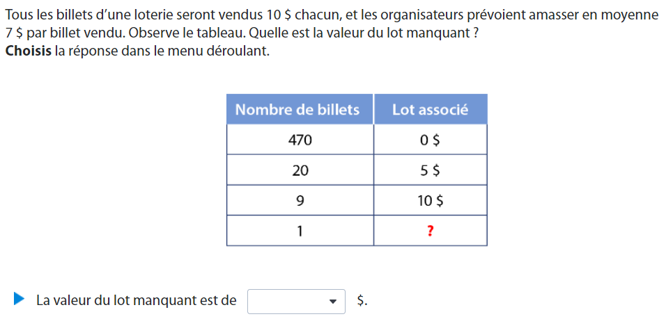 Secondaire 5 • 4aBonjour je voudrais savoir comment je doit trouver la valeur du lot manquant si j'ai le nombre de billets et la valeur des lots par nombre de billets.