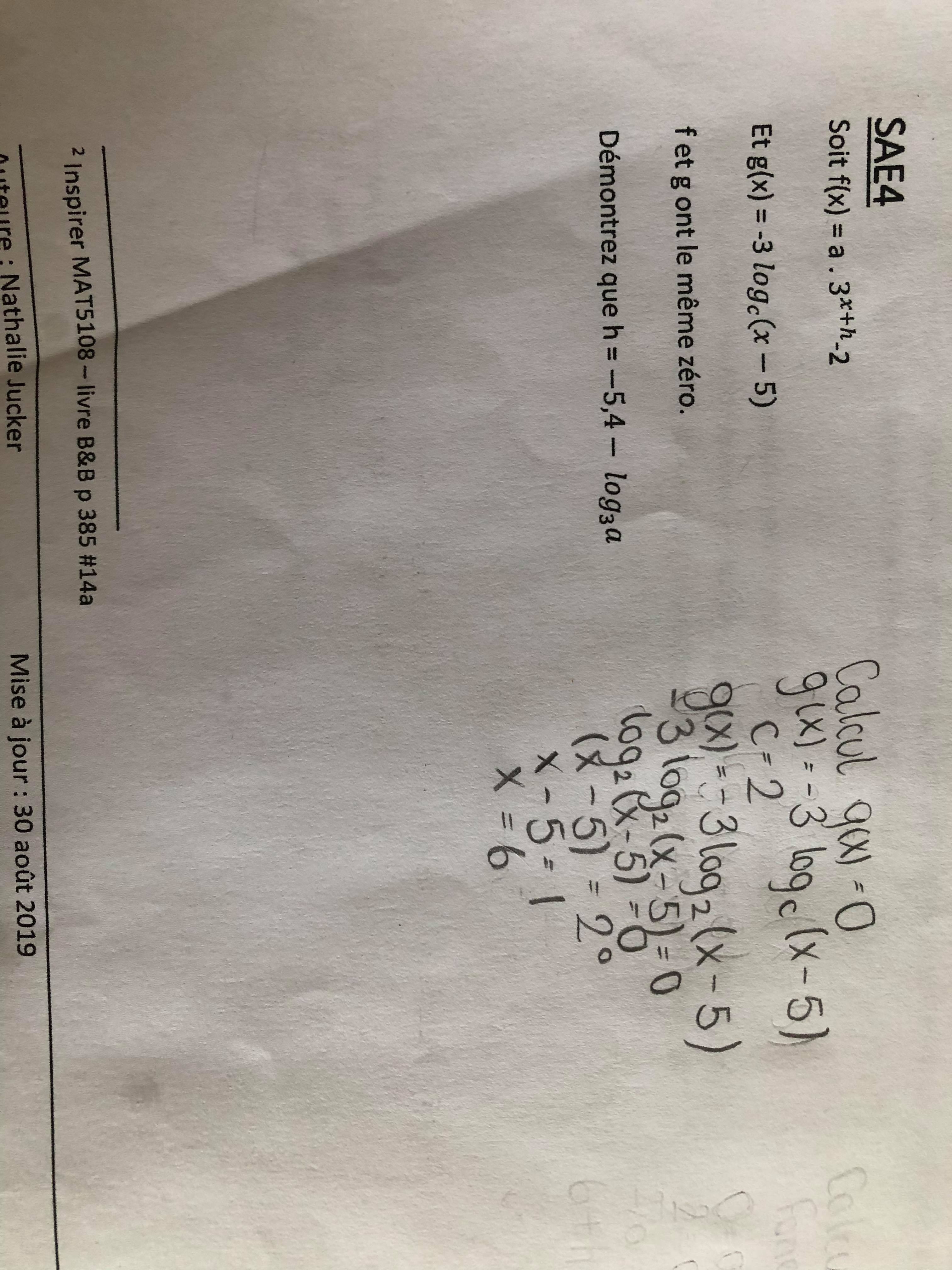 Est-ce que quelqu'un d'entre vous saurais comment démontrer que h=-5,4-log3a? J'ai déjà calculer le zéro de la fonction g(x), donc je peut utiliser ces coordonnées pour la fonction f(x) mais j'ai quand même deux inconnus dans cette fonction...