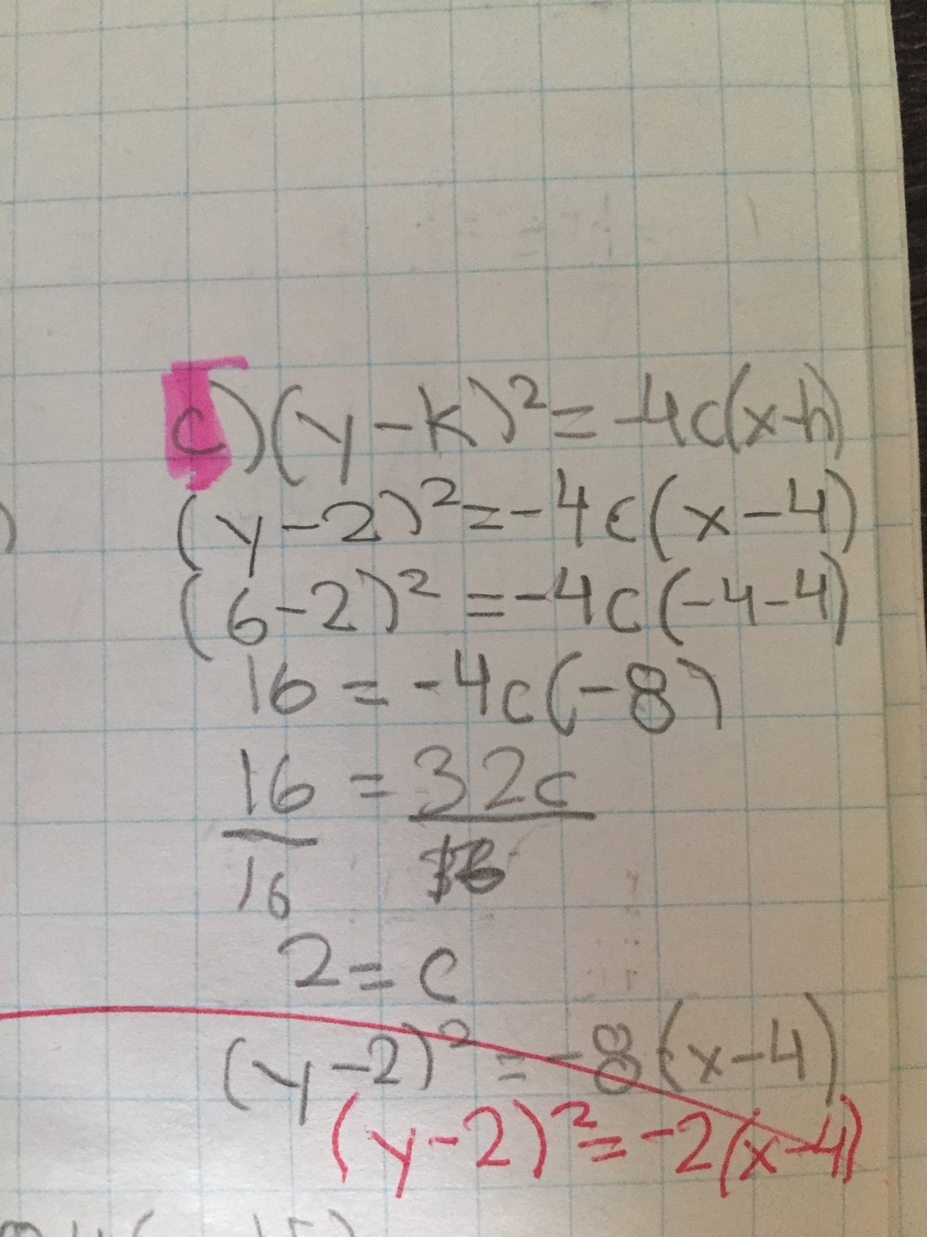 dans ce numéro,pour la lettre c ,j’ai obtenu comme reponse (y-2)^2 = -8(x-4) mais le corrigé a comme réponse (y-2)^2 =-2(x-4)