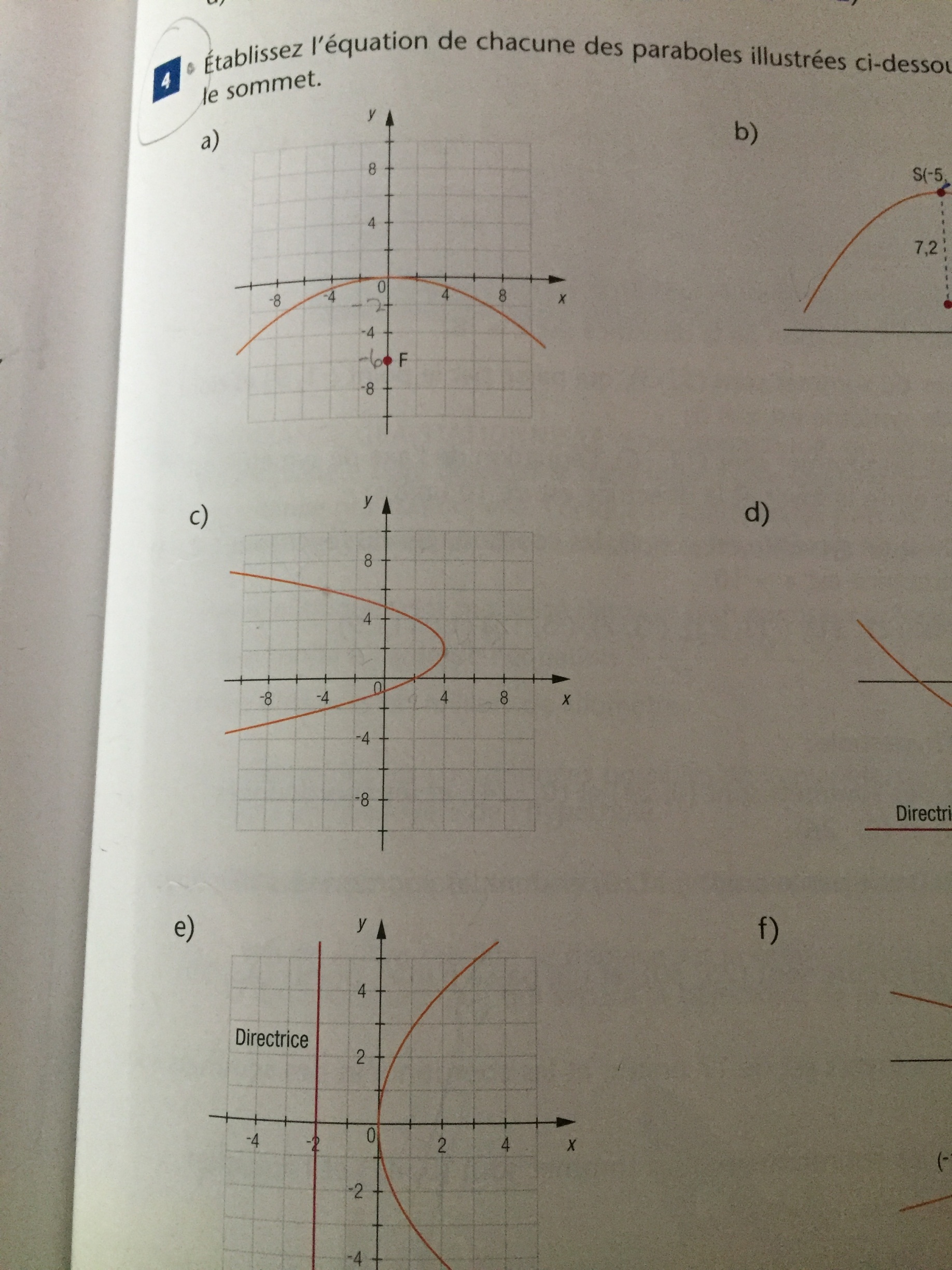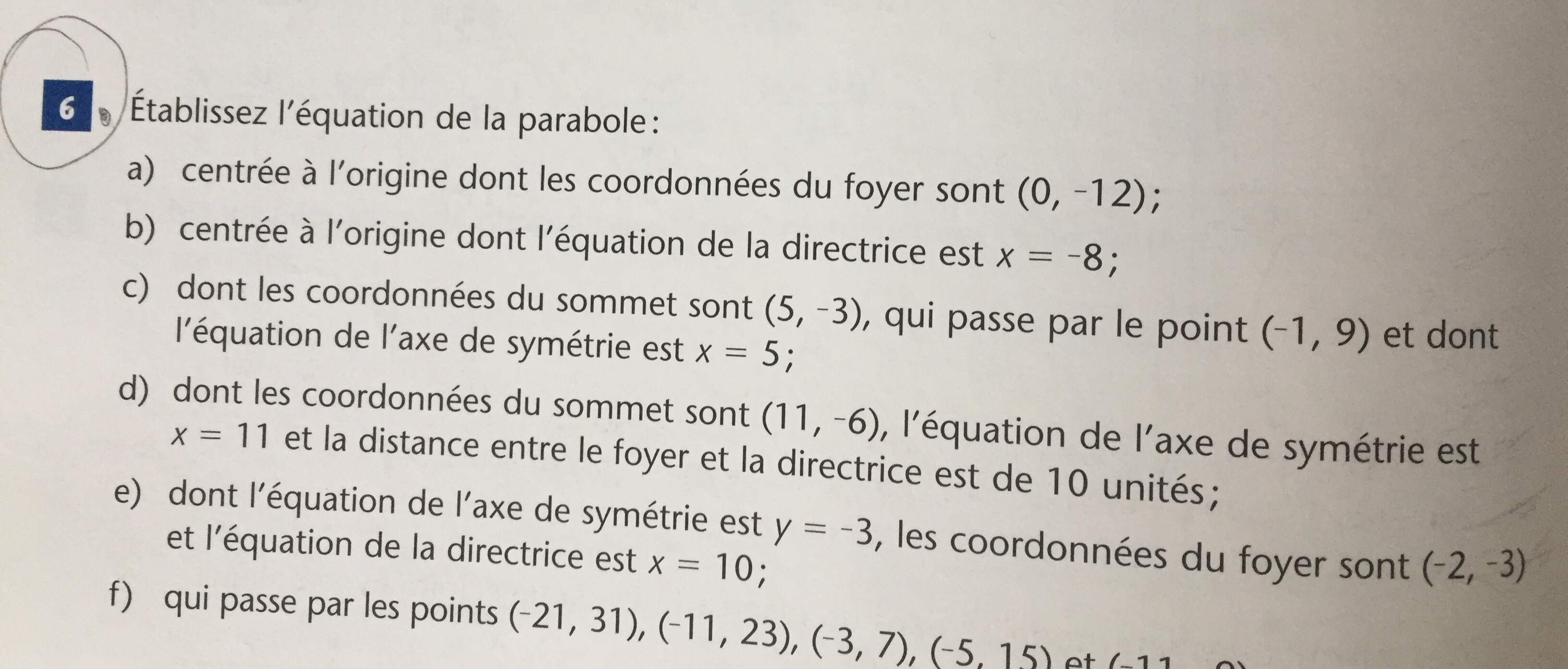 Secondaire 5 • 4aBonjour pour la lettre d et e de ce numéro,j’obtiens comme réponse pour le d :(x-11)^2 =20(y+6).Le corrige obtient 40 au lieu de 20 ,pourquoi ? Et pour la lettre e j’obtiens comme réponse (y+3)^2 =-24(x+2) tandis que le corrigé a (y+3)^2 = -24 (x-4)