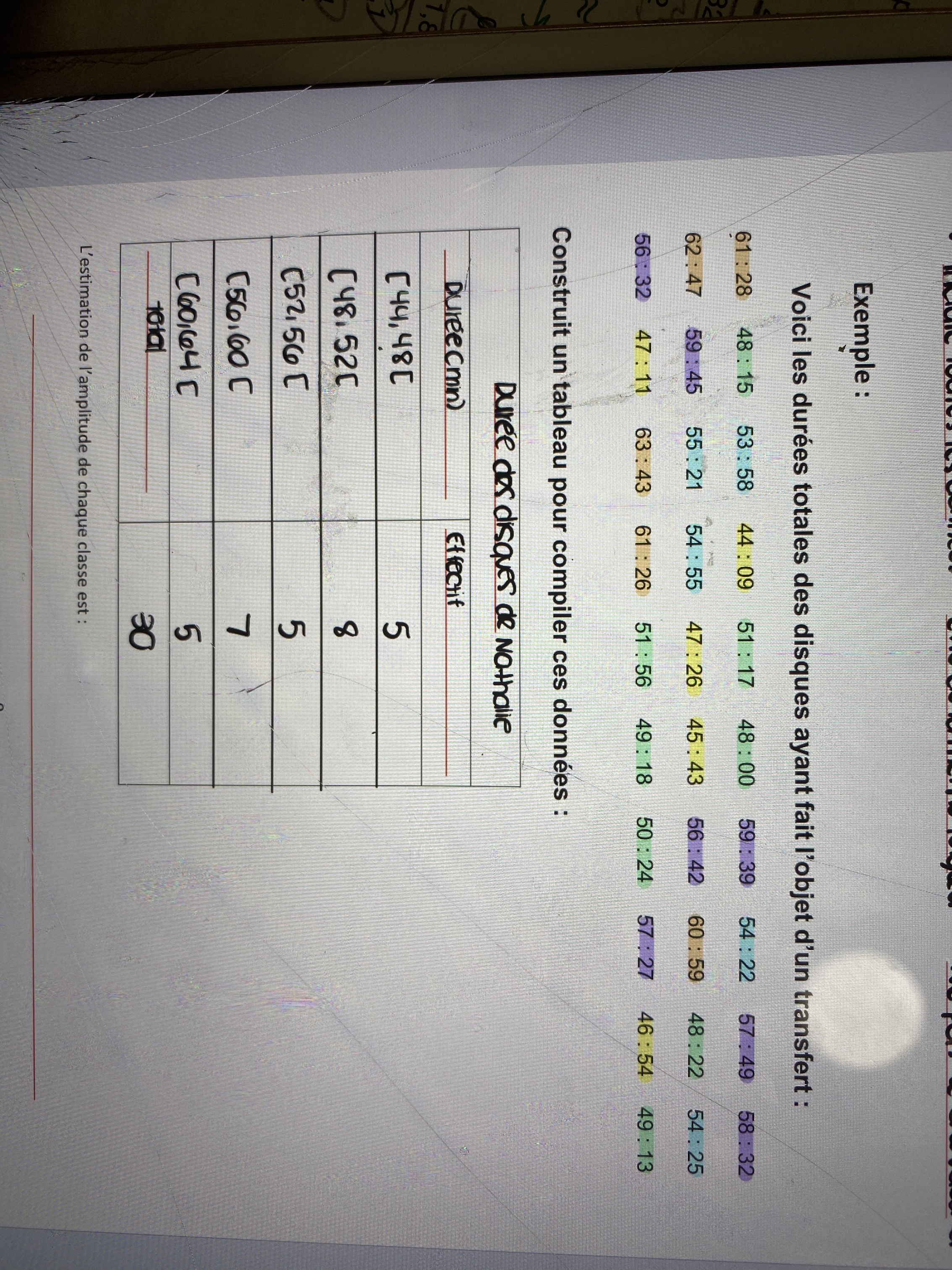Secondaire 3 • 4aBonsoir, je sais comment créer un tableau pour compiler des donnés mais ce numéro comporte des données un peu étrange avec deux chiffres et je ne me rappelle plus comment j’ai réussi à réaliser ce numéro. Aussi, comment fais-je pour trouver l’amplitude dans ce cas-ci? D’habitude on fait: la donnée la plus élevée - la donnée la moins élevée divisé par le nombre de classes, mais encore une fois, les données dans ce numéro sont bizarres alors quelle est la donnée la plus élevée et la donnée la moins élevée?😭
