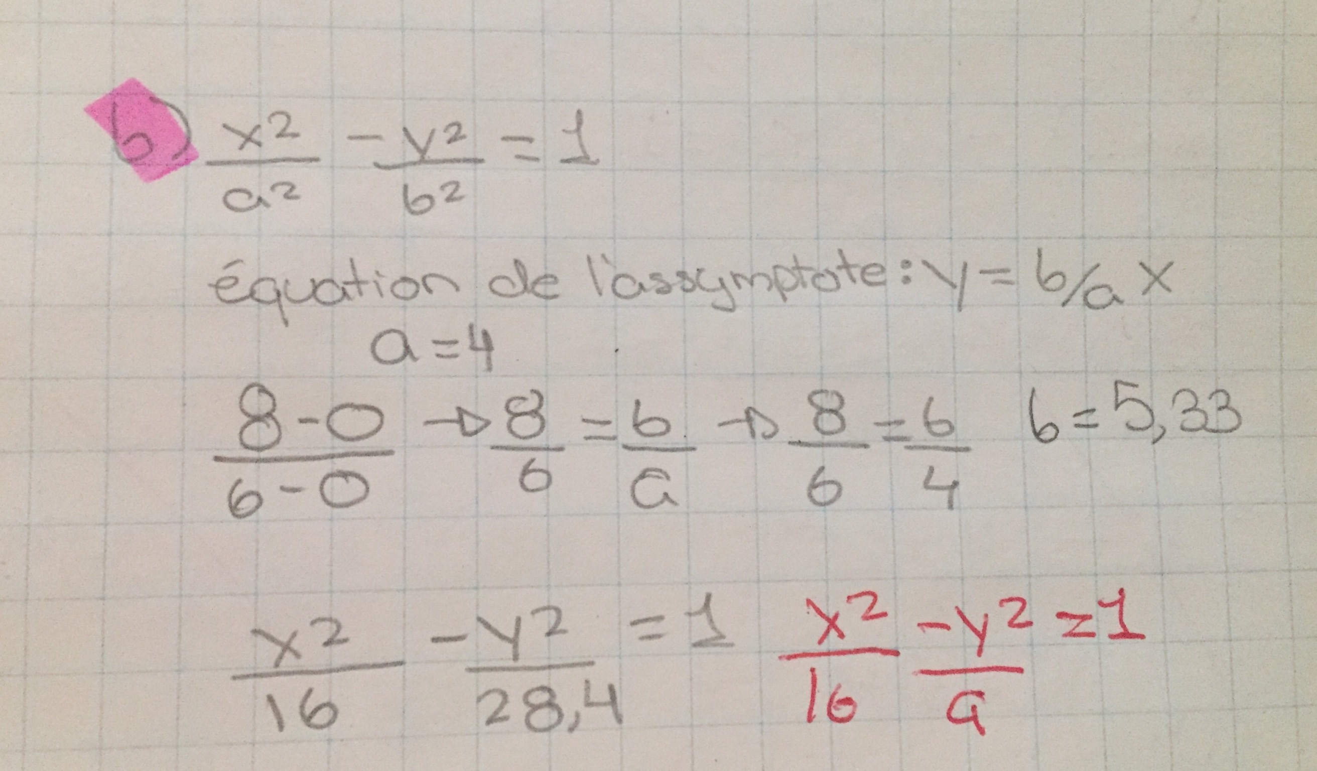 Secondaire 5 • 4aBonjour ,dans ce numéro j’ai obtenu comme réponse x^2/16 -y^2/28,4. .Cependant ,dans le corrigé la réponse est x^2/16 -y^2/9