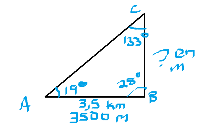 J'aurais besoin d'aide avec ce problème dont je suis bloquée. Probablement je n'arrive pas à la bonne réponse, car mon schéma n'est pas bon.Problème : 2 personnes qui se trouvent en des points A et B, distants de 3,5 km, observent une montgolfière. Du point A, l'angle d'élévation est de 19° ; au même instant, l'angle d'élévation du point B est de 28°. Les yeux de ces 2 personnes se trouvent à 1,75 m du sol. À ce moment, à quelle hauteur, en mètres et arrondie au centième, se trouve la montgolfière par rapport au sol?Voici mon schéma / dessinMerci et bonne soirée! :)
