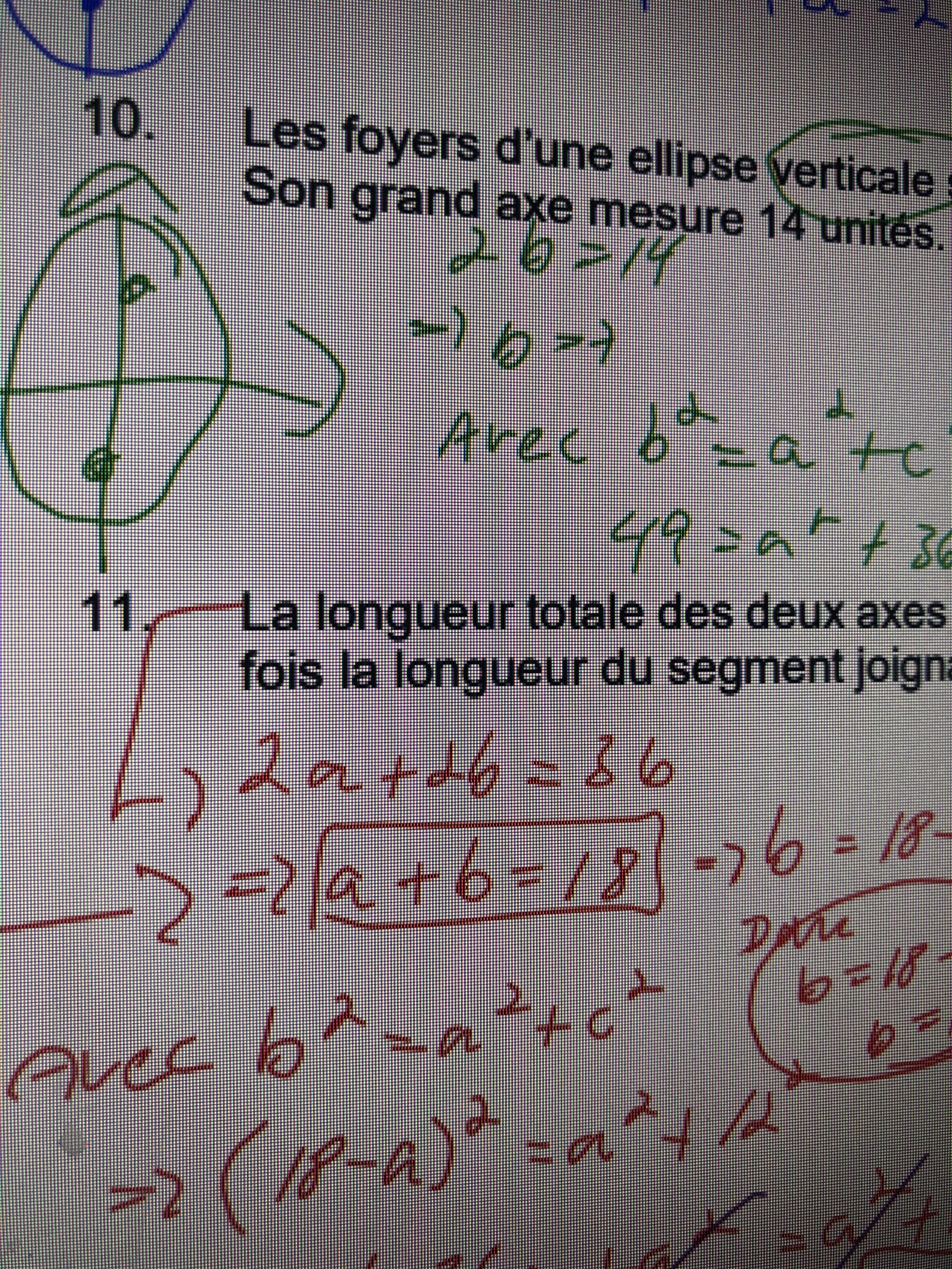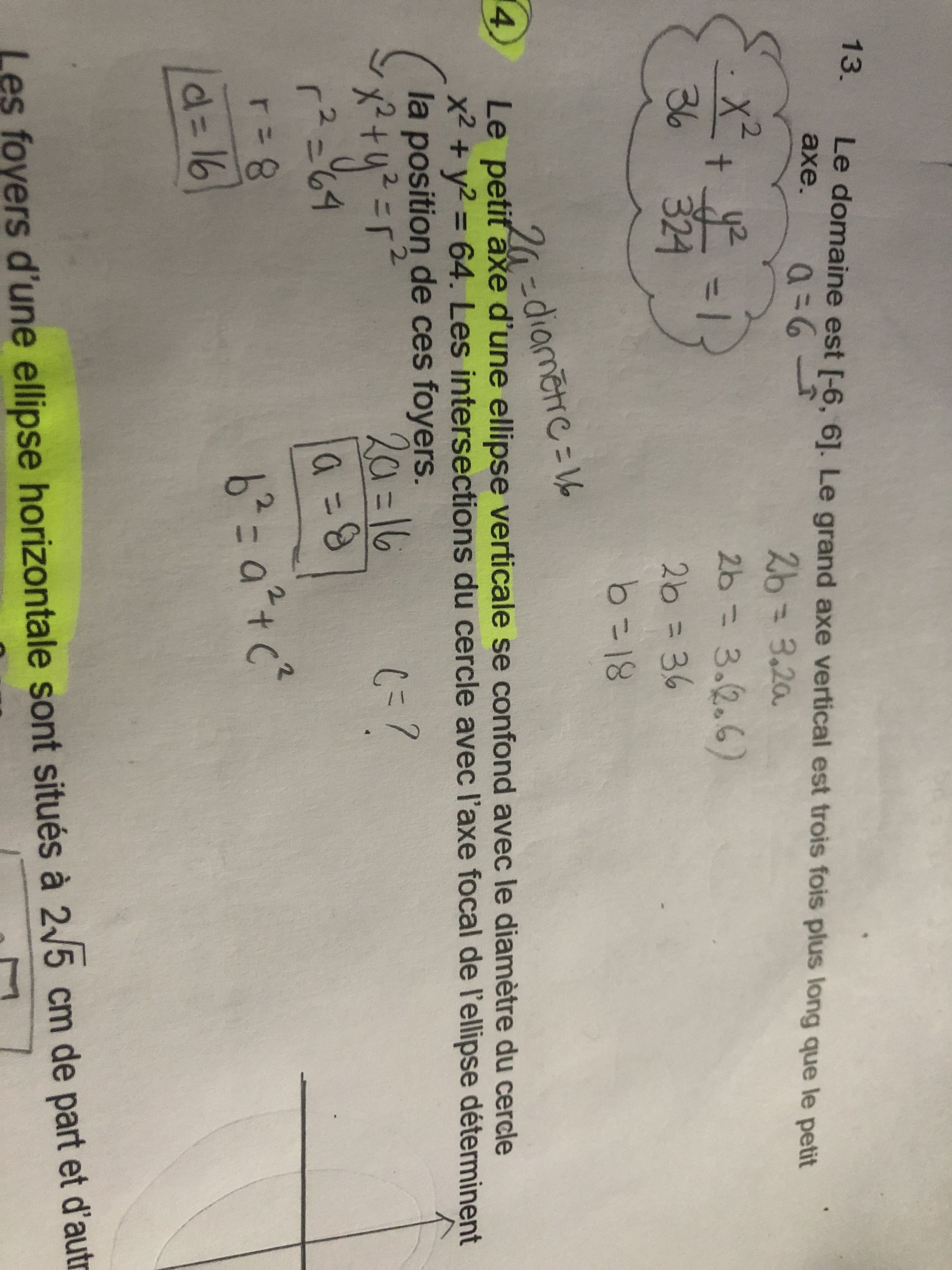 Secondaire 5 • 4aBonsoir , j’ai un problème avec le #14 , je sais pas comment trouver le c pour que je puisse trouver la regle de l’éllipse, pouvez vous m’aider svp ?j’ai juste réussi à trouver le amerci