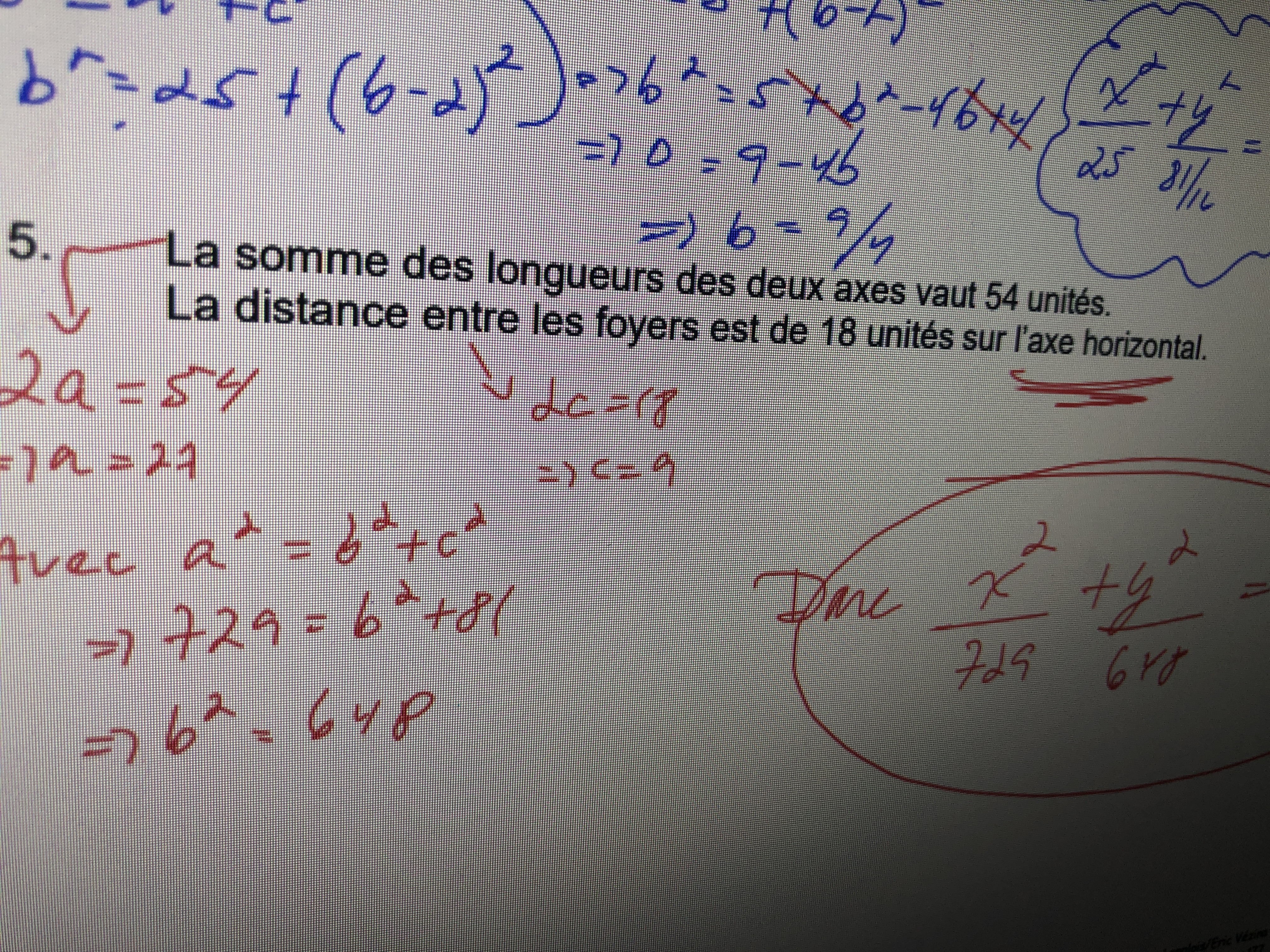 Secondaire 5 • 4aBonsoir , ma question est sur le numéro 5, je crois qu’il y a une erreur dans le corrigé , « la somme des longueurs des 2 axes vaut 54 unité » le prof a écrit que 2a= 54 mais ça devrait être 2a + 2b = 54 non ? Puisqu’il y a 2 axes .