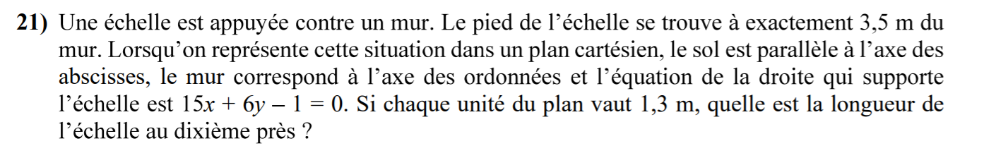 J'aurais besoin d'aide avec ce problème de math.Voici ce que j'ai fait, mais je n'arrive malheureusement pas à la bonne réponse. J'ai utilisé la formule entre un point et une droite. La bonne réponse est de 9,4 m. Après avoir trouvé la distance, j'ai fait x (fois 1,3 m comme indiqué dans l'énoncé), mais je n'arrive pas à la bonne réponse. Je pense que c'est une erreur d'inattention, mais je ne suis pas sûre, donc pouvez-vous svp m'aider.