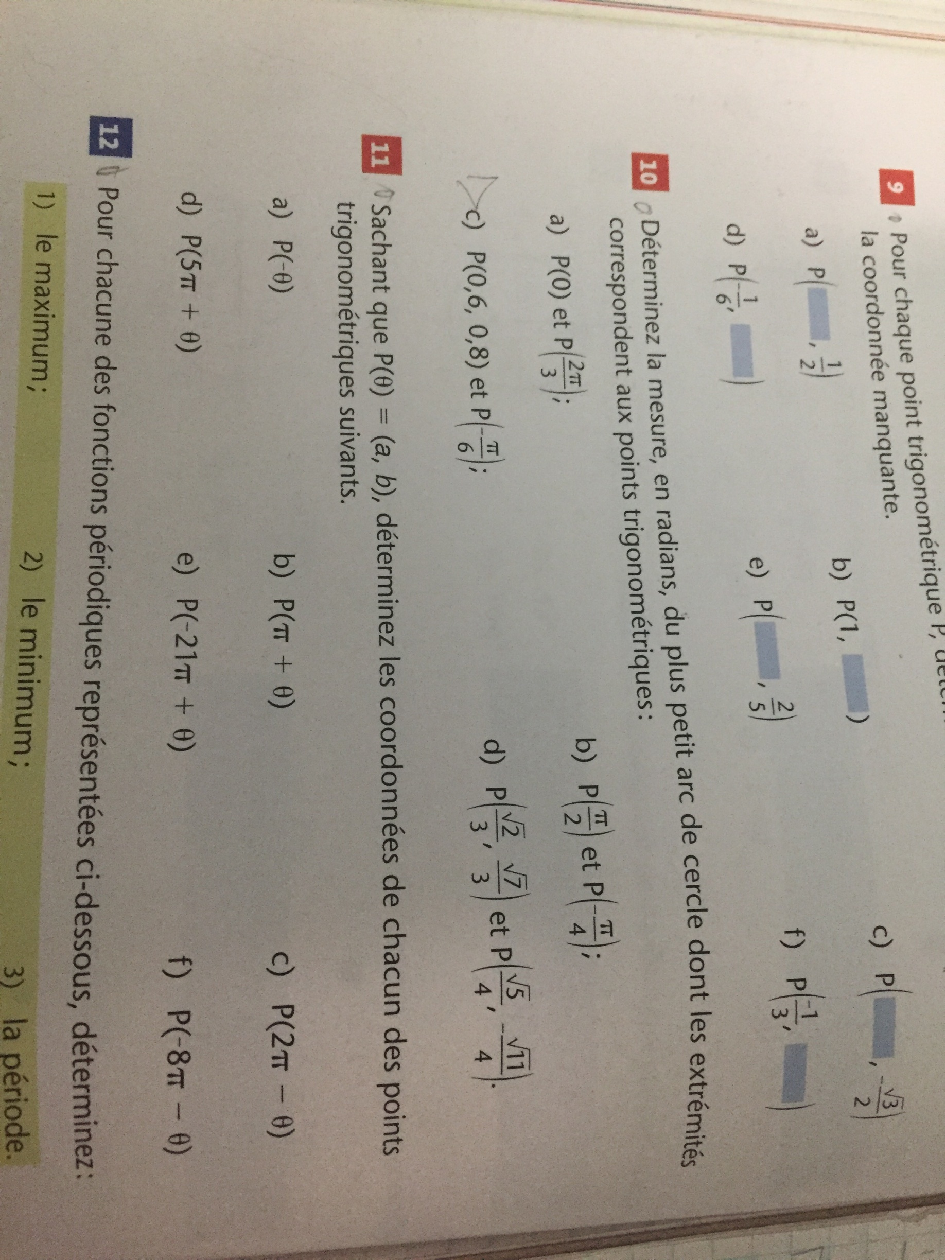 Secondaire 5 • 4aBonjour, je suis en secondaire 5 et je me demande comment il faut faire pour trouver les coordonnées d'un point trigonométrique. Par exemple ceux du point 28Pi/3. Je sais qu'on fait (cos0, sin0), et la relation de pythagore. Ce que j'obtiens comme réponse ce n'est pas les fractions mais des chiffres réels (sur la calculatrice). Donc je me demande c'est quoi la démarche à faire pour trouver les coordonnées en fraction comme dans le cercle trigonométrique. Merci